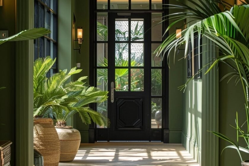 The hallway’s design is inspired by a small garden, offering an open and airy space filled with potted plants. The light green and dark brown color palette creates a serene atmosphere reminiscent of a natural setting.