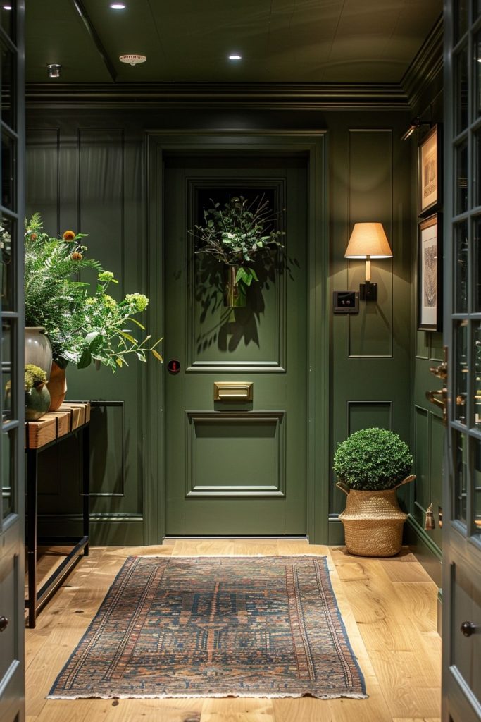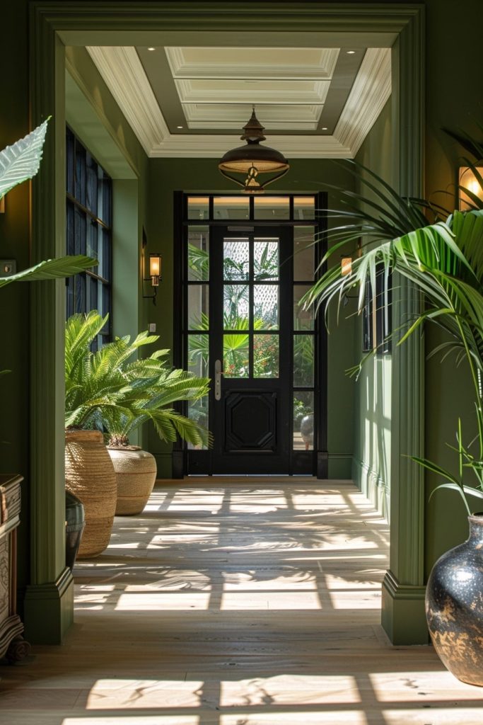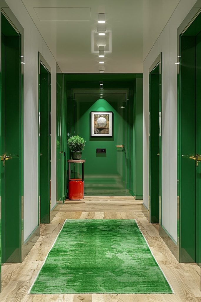 The hallway was adorned with a soothing, jewel-toned emerald green that was offset by crisp white walls, creating a rhythmic and harmonious balance. The design was completed with the addition of potted plants.