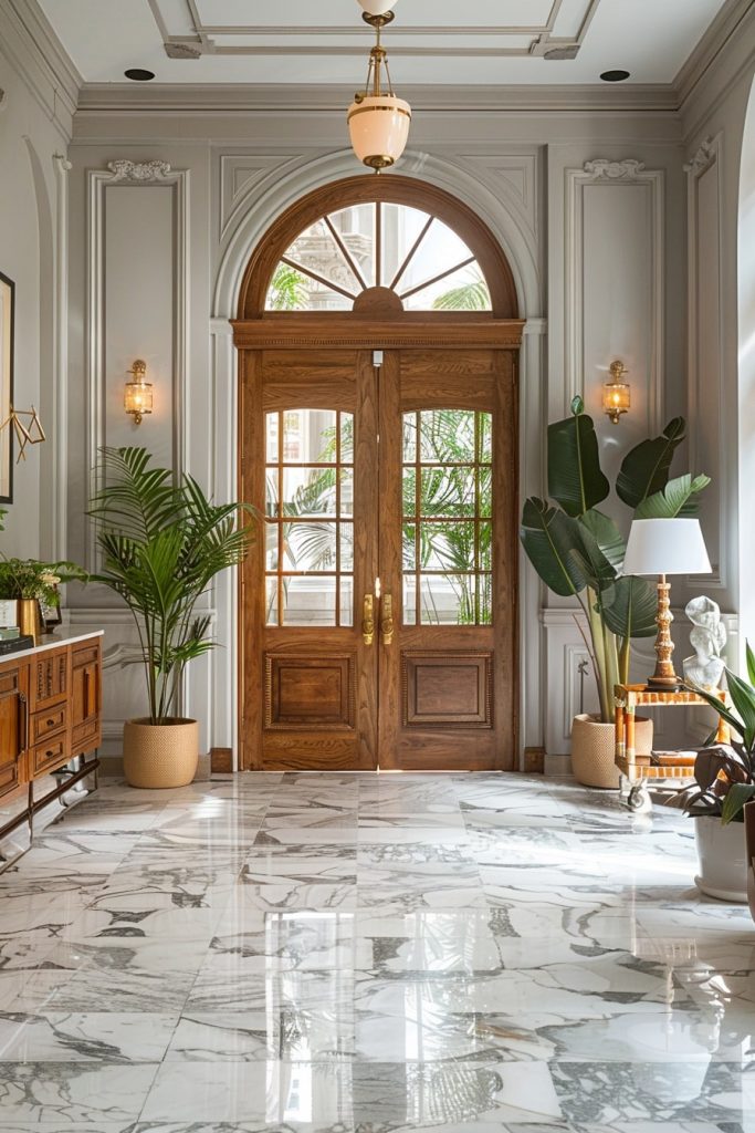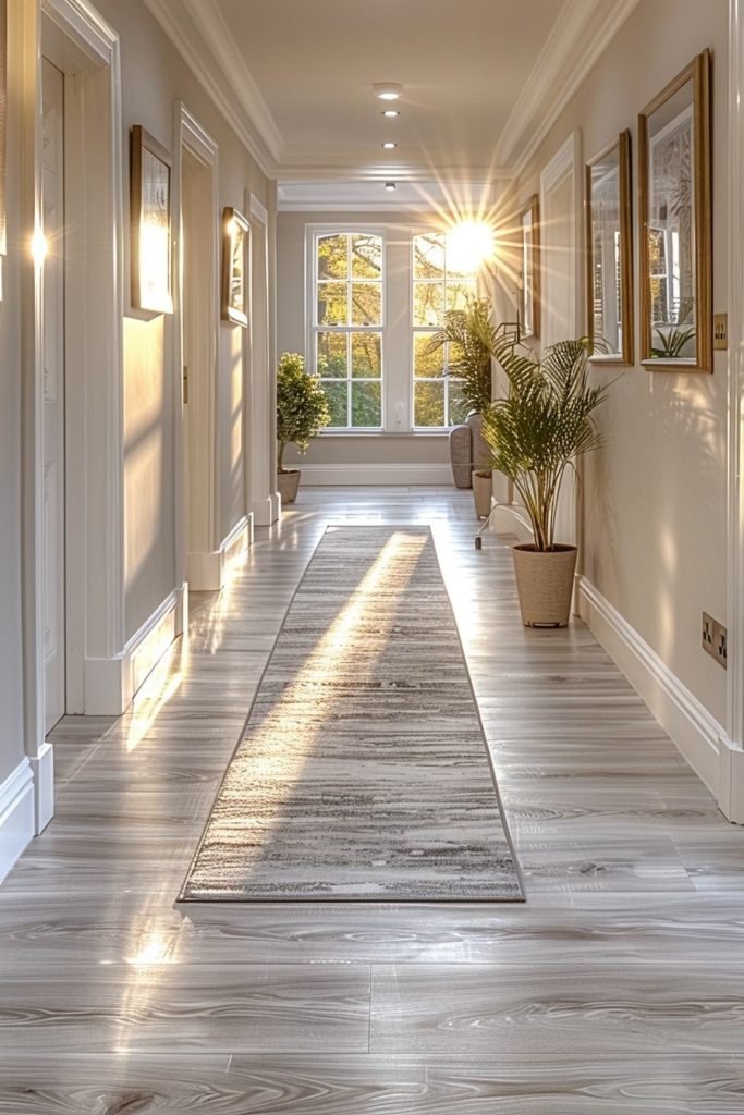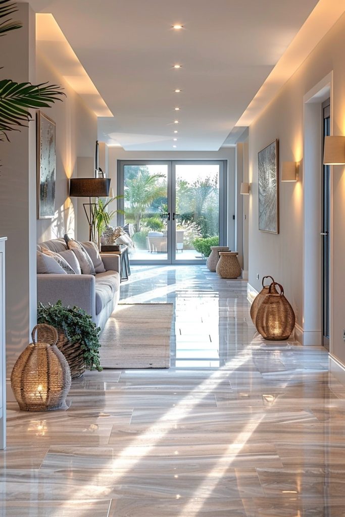 The luxurious hallway was reminiscent of old-world castles, but with a modern flair. The clean white palette provided a soothing backdrop, and the lush greenery brought a sense of tranquility to the space.