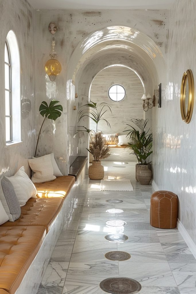 The hallway is a serene space featuring polished white tiles, a cozy bench, a reflective mirror, and vibrant plants. This design creates a calming and open ambiance.