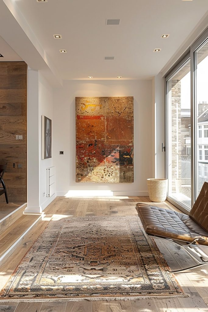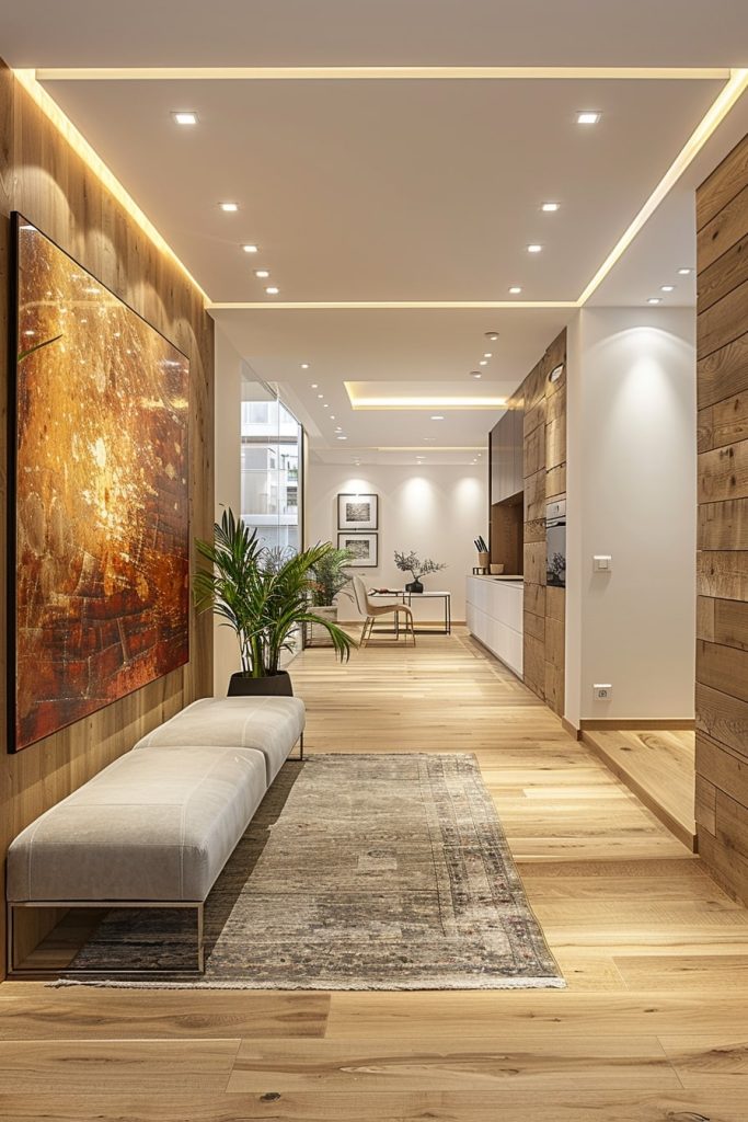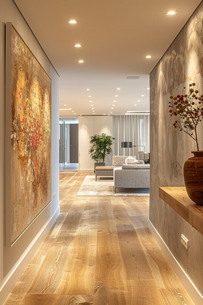The simple family hallway featured striking wooden elements against a backdrop of pristine white walls, creating a minimalist and natural atmosphere. A large painting, a plush armchair, and a potted plant transformed the space into a cozy home gallery.