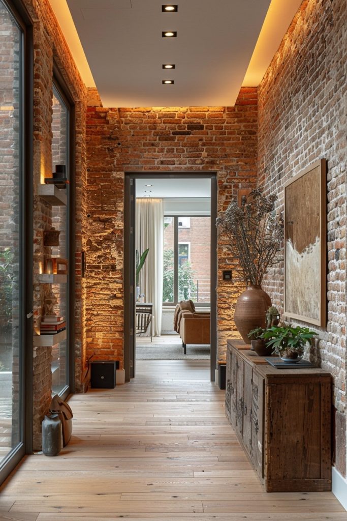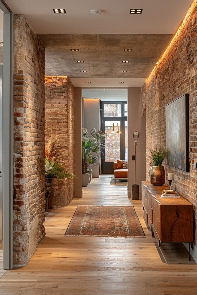 The family hallway features a rustic brick wall that adds a touch of ruggedness to the space. A modern ceiling design, paired with warm ambient lighting, creates a timeless and inviting atmosphere.