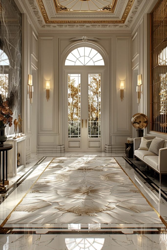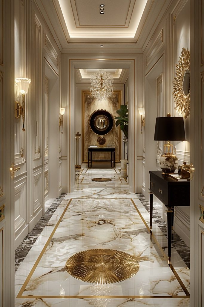The hallway was designed with a royal aesthetic, featuring pristine white walls adorned with accents of gold. The gold decorative elements further emphasized the opulent atmosphere.
