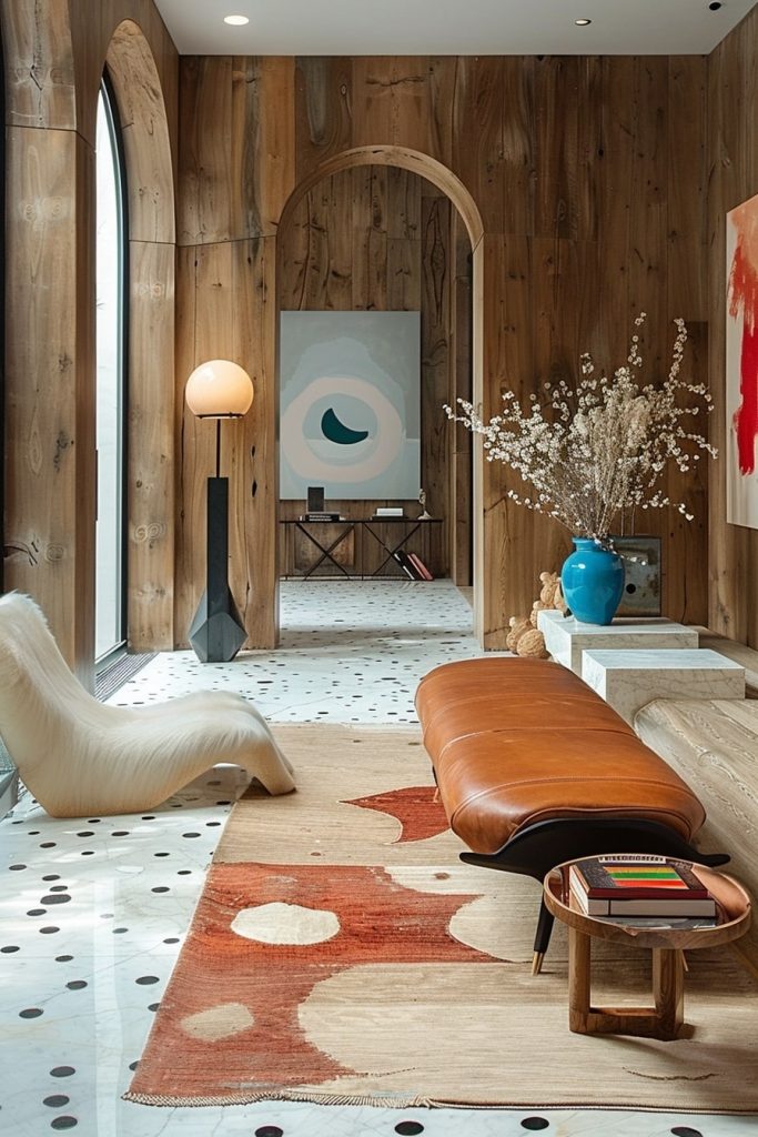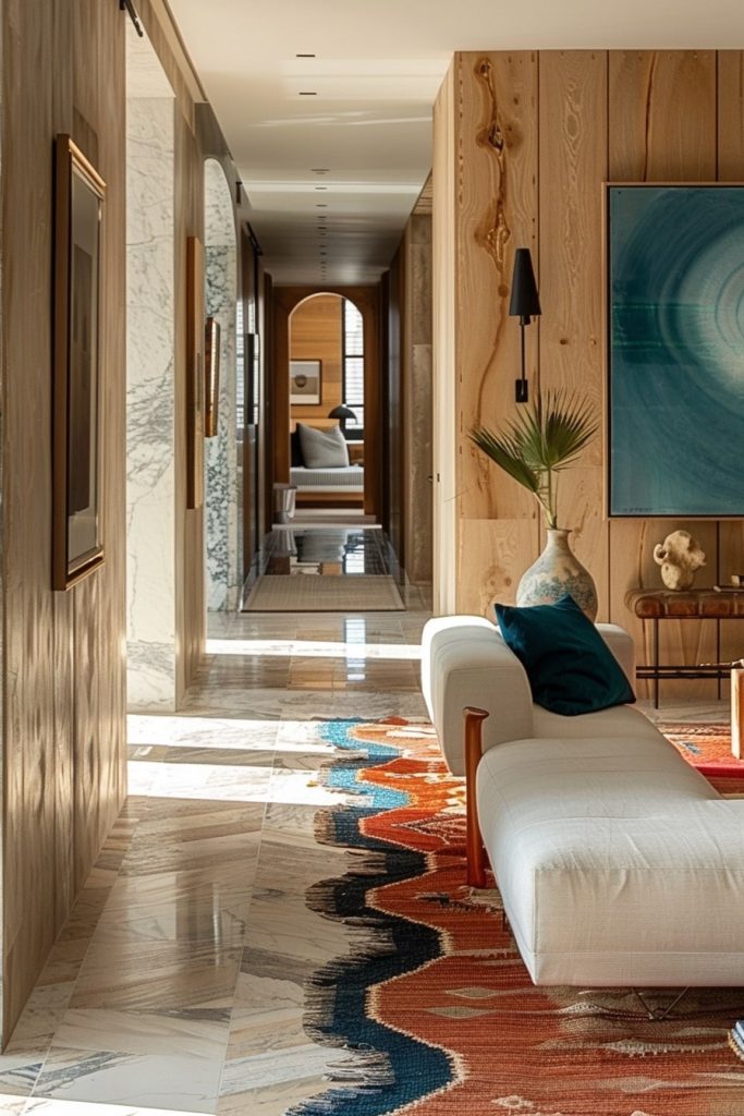 The hallway is a haven for the artistic soul, featuring a vaulted wooden ceiling and a cool, polka-dot tiled floor. Adorned with intricate artwork and vibrant flowers, the space offers a unique blend of complexity and creativity, while maintaining an airy atmosphere.