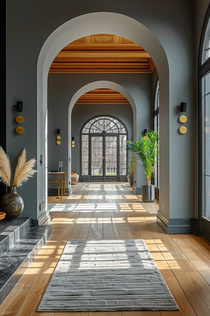 The hallway’s innovative vaulted ceiling, paired with cool gray walls and warm wooden floors, creates a striking visual contrast. Large windows flood the space with natural light, fostering a sense of openness and tranquility.