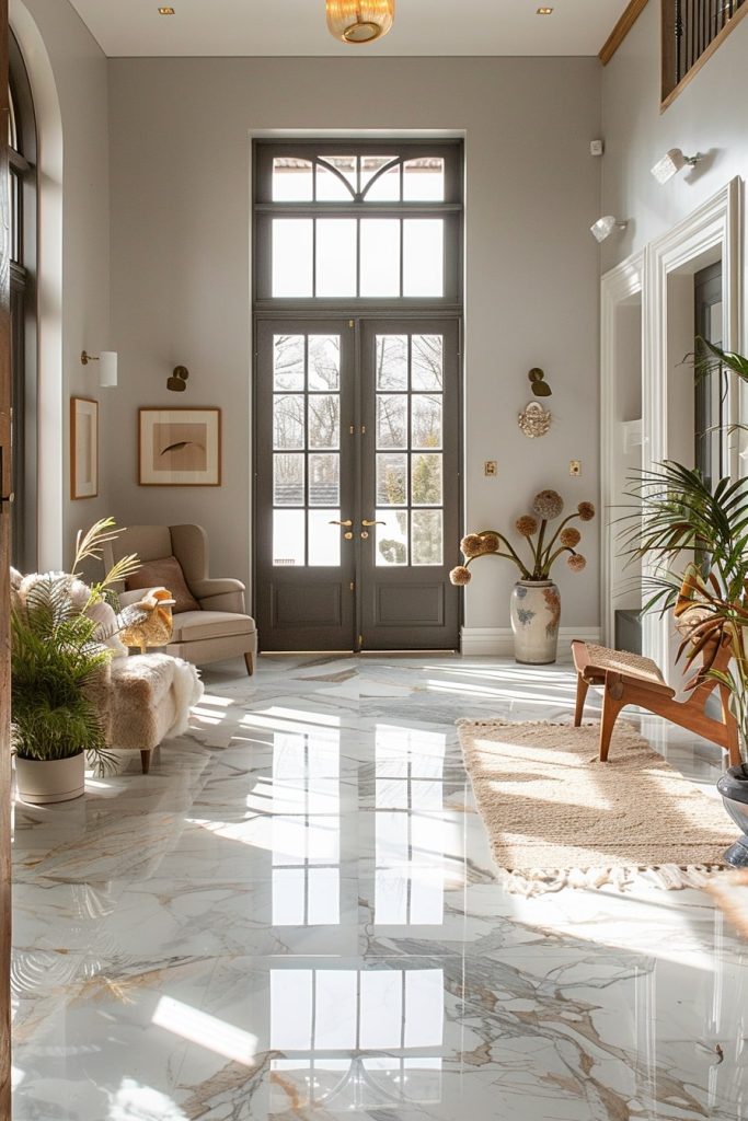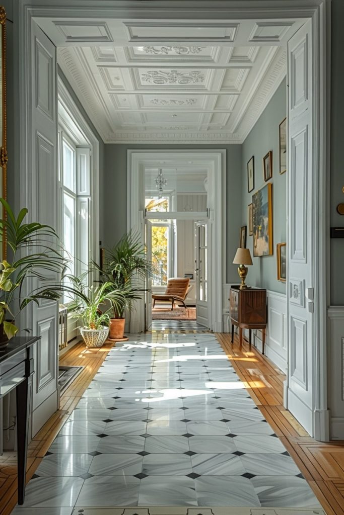 The elegant hallway features pristine white walls and a striking floor design that combines wood and polished tiles. The addition of potted plants creates a timeless and sophisticated ambiance.