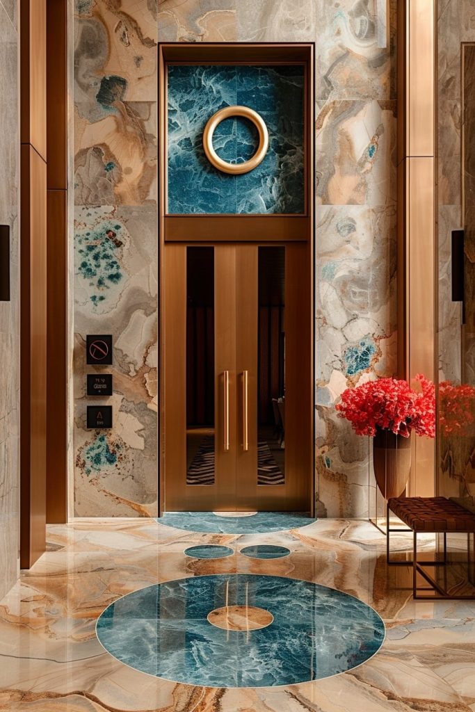 The hotel hallway exudes a sense of opulent modernity with its glossy brass tiles. The bold color palette of deep blues and reds, combined with a blocky, geometric design, creates a visually striking and unconventional space.