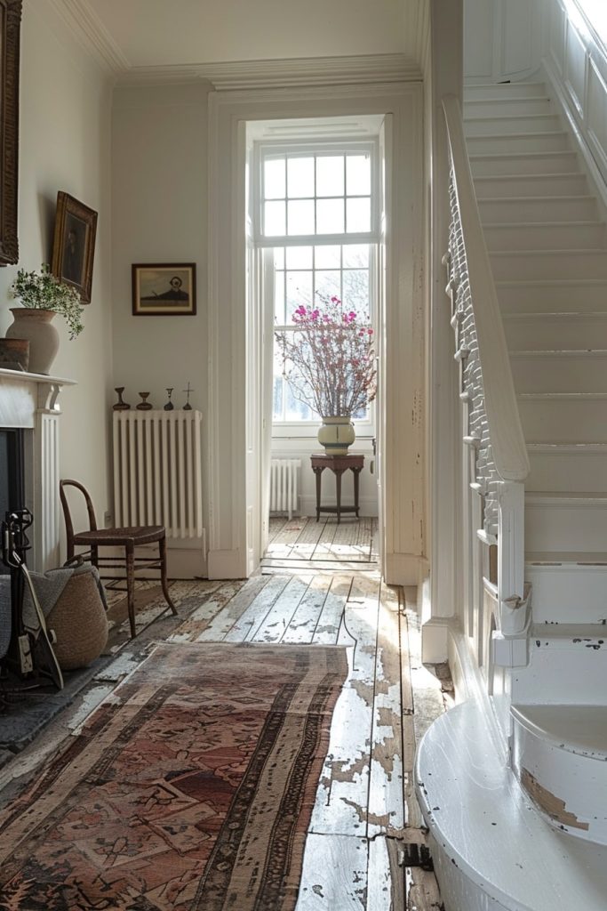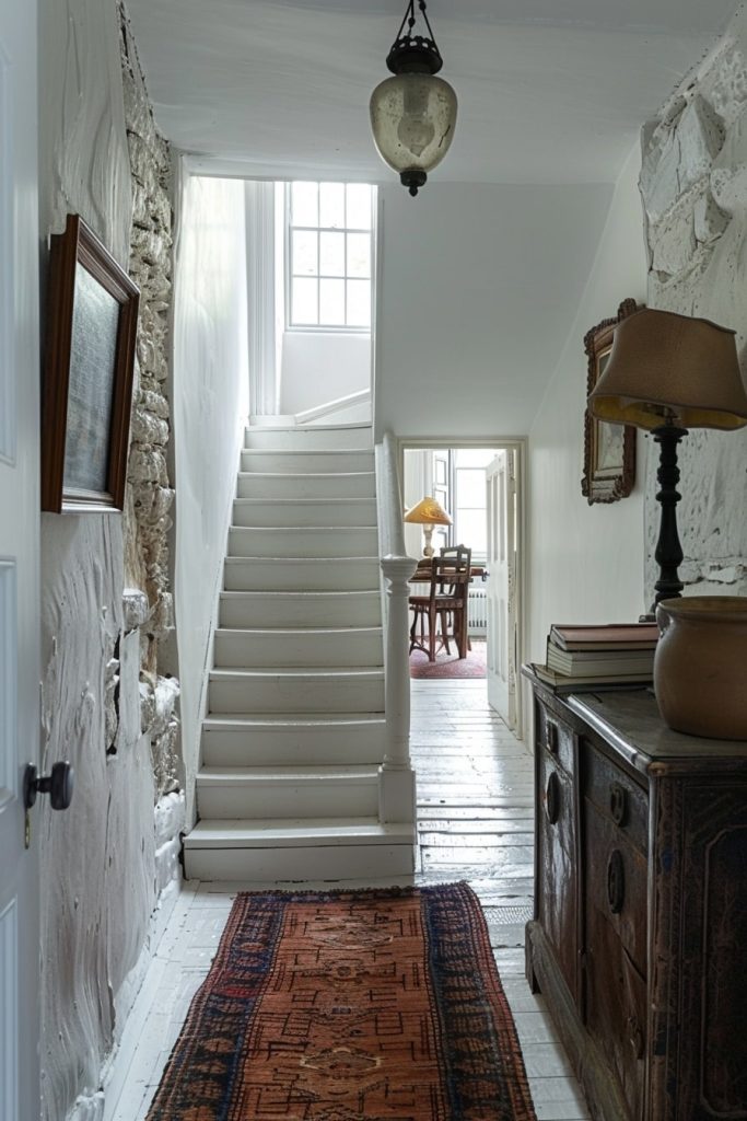 The narrow white hallway beneath the staircase offered a clean and airy atmosphere. The antique 19th-century wooden cabinet added a touch of nostalgia to the design, while the bright white color palette prevented the space from feeling cramped.