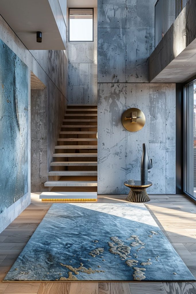 The hallway was designed with a minimalist aesthetic, featuring a deep blue hue that created a profound, artistic atmosphere. The rough concrete walls contrasted with the warm, natural wooden floor and large sunlit windows, offering a balance of the industrial and organic.