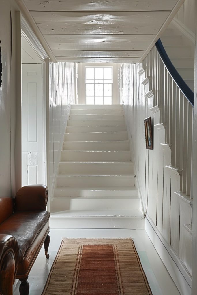 The simple white staircase hallway exudes a sense of tranquility and peace. Adorned with a small painting and a cozy armchair, it invites relaxation and a feeling of home.