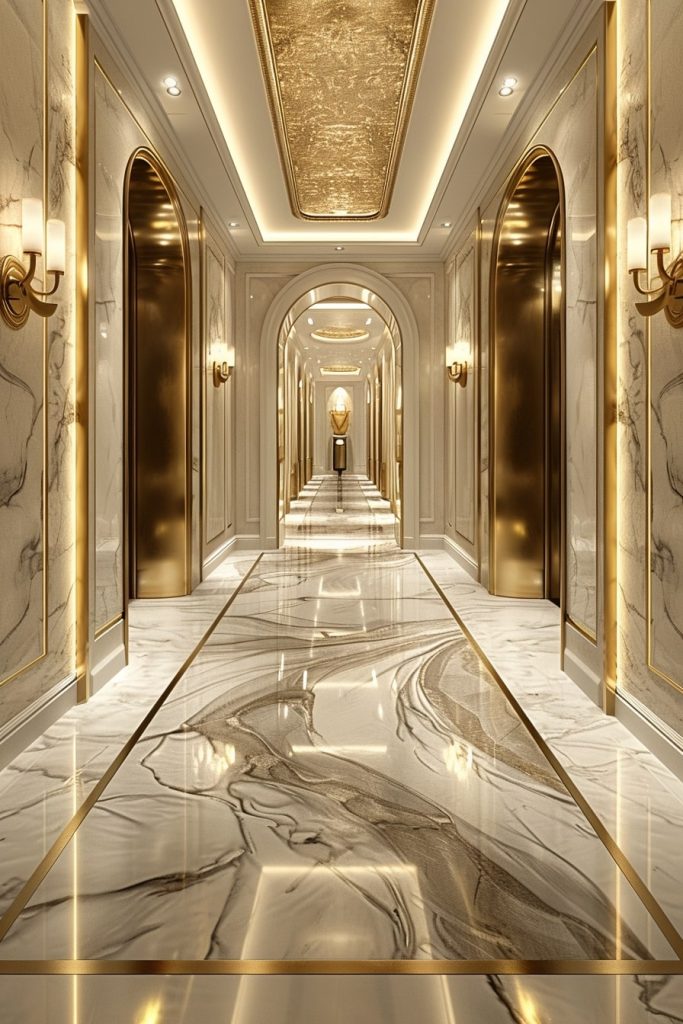 The opulent hotel hallway was a dazzling display of gold and platinum, its expansive space accentuated by the simple yet elegant design. The intricate patterns of the tiles and the lustrous finishes created a truly regal atmosphere.