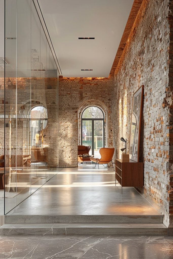 A fusion of contemporary design and timeless, classic brickwork crafts a space that is both minimalist and harmonious. The sleek, glassy flooring stands in stark contrast to the rugged texture of the brick, creating a captivating visual tension. The overall ambiance is one of understated warmth.