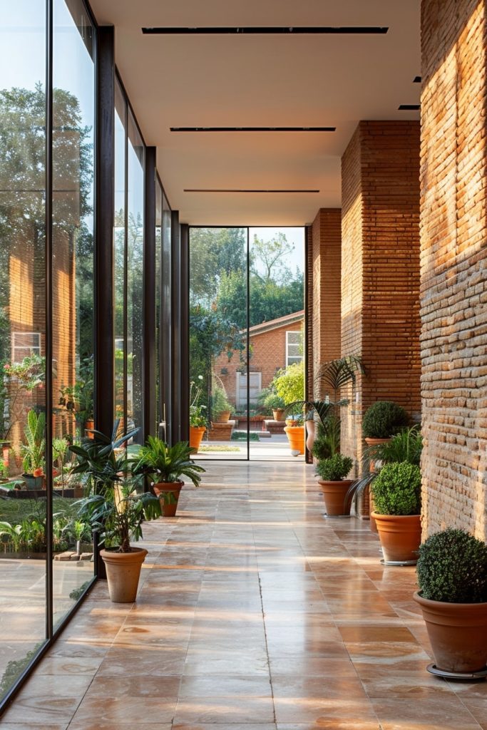 A sun-drenched hallway, adorned with elegant glass doors, invites a refreshing breeze and the tranquility of nature through the lush greenery of potted plants. The juxtaposition of sturdy brickwork against the sheer glass wall creates a visually captivating and dynamic space.