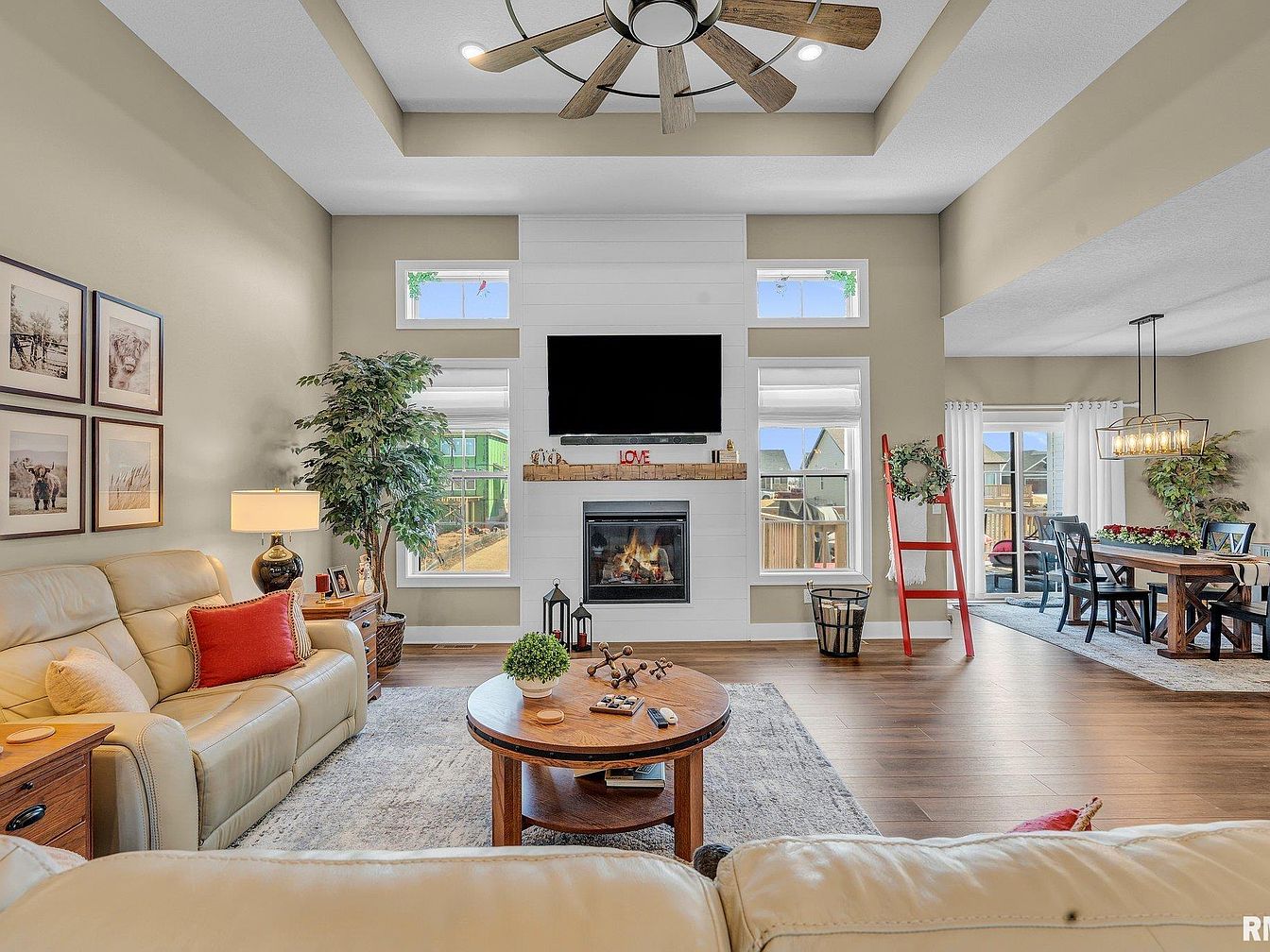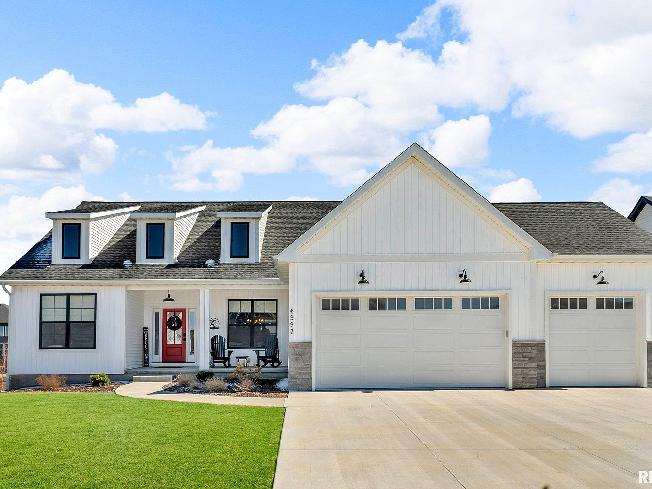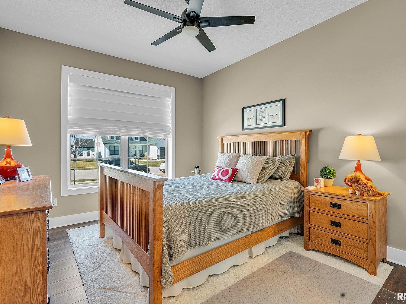 This beautifully designed home in Bettendorf, IA, embodies a modern farmhouse architectural style with its clean white exterior, contrasting dark window frames, and inviting red front door. Featuring 5 bedrooms and 3 bathrooms, this property offers over 3,000 square feet of spacious living area within the highly regarded Pleasant Valley School District. The open floor plan showcases vaulted ceilings, luxury vinyl plank (LVP) flooring for durability, and premium quartz countertops throughout. The kitchen is a highlight with a large island, walk-in pantry, and abundant storage, fluidly connecting to an informal dining area with direct access to a deck perfect for enjoying the backyard. The primary suite includes a private bathroom and a walk-in closet for ample storage. A finished basement adds a large recreation room, two additional bedrooms, and notable storage spaces, including a soundproof bedroom designed as a music room with extra insulation and acoustic tiles, plus a hidden storage compartment behind the full bathroom cabinet. An additional powered storage shed provides extra space for tools and equipment. Priced at $669,000, this move-in-ready home combines comfort, style, and functionality on a well-maintained lot.