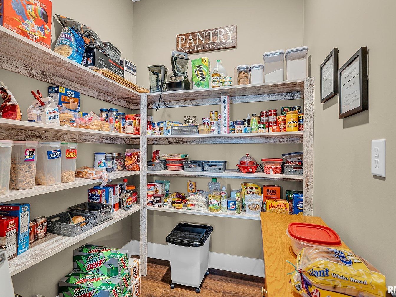 This spacious pantry features sturdy, rustic wooden shelving with a distressed white finish that contrasts warmly against soft beige walls. The shelves are well-stocked and organized with a variety of dry goods, canned items, and kitchen essentials. Clear, airtight containers hold cereals neatly, while baskets corral smaller products, maintaining order. A wooden sign above the shelves reads “PANTRY Open 24/7,” adding a charming, homey touch. The flooring is a rich, medium-toned hardwood, complementing the natural wood of a small side table holding extra bread and storage containers. Functional yet inviting, the space is perfectly designed for easy access and tidy storage.