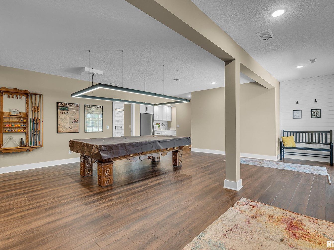 This spacious recreation room showcases a rich dark wood floor that creates a warm, inviting foundation. At the center, a classic pool table covered with a protective cloth stands beneath a large, modern rectangular light fixture that provides ample illumination. The walls are painted a soft beige, complemented by a partial brick accent wall doubling as a bar area with three industrial-style black metal and wood stools. Sliding glass doors offer natural light and access to the backyard. The adjoining lounge area features a mounted flat-screen TV and cozy seating, balancing leisure and entertainment perfectly.