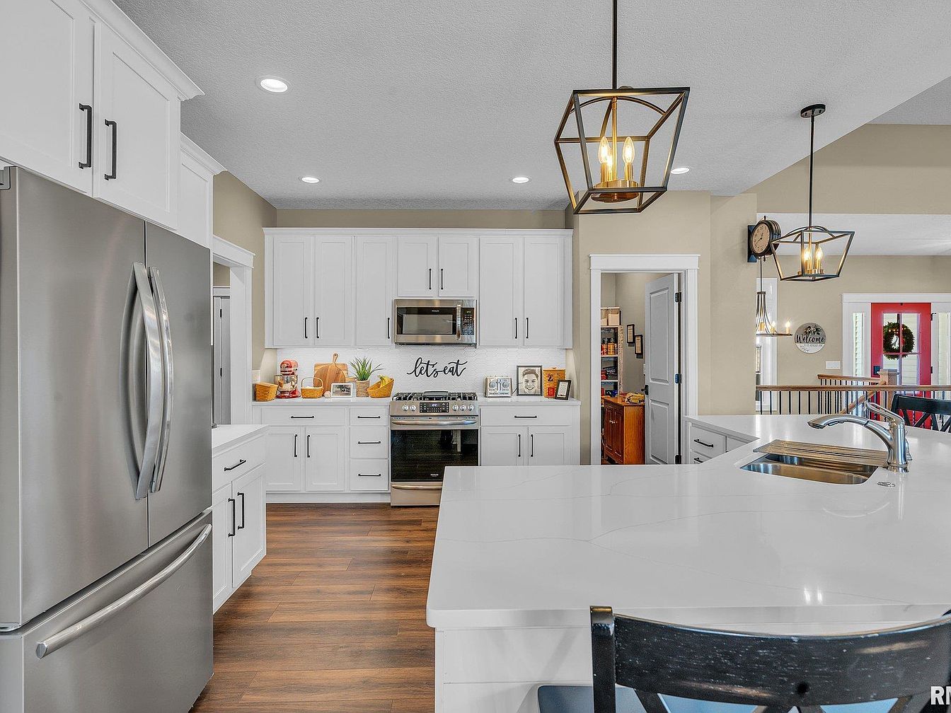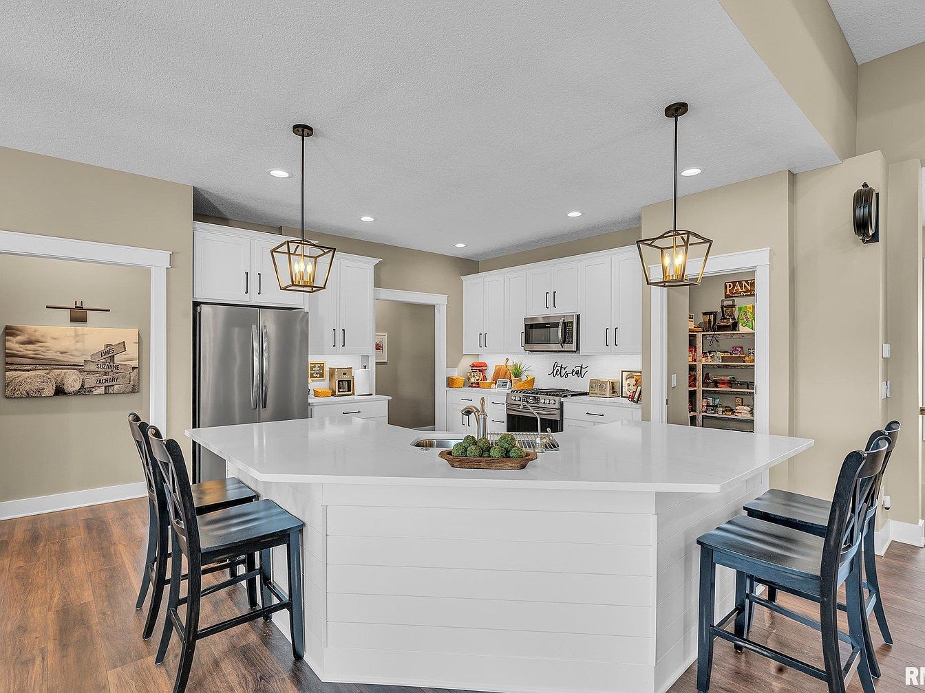 This kitchen features an open, airy layout with a clean, modern design. White cabinetry with black handles provides a crisp contrast against warm beige walls and rich, dark hardwood floors. Stainless steel appliances, including a refrigerator and oven with an over-the-range microwave, add sleek functionality. The expansive white quartz countertop offers ample workspace and seating, highlighted by a built-in sink and contemporary black bar stools. Geometric pendant lighting with exposed bulbs contributes a stylish industrial touch. Decorative accents and a “let’s eat” wall sign enhance the cozy, inviting atmosphere, blending function with tasteful style.