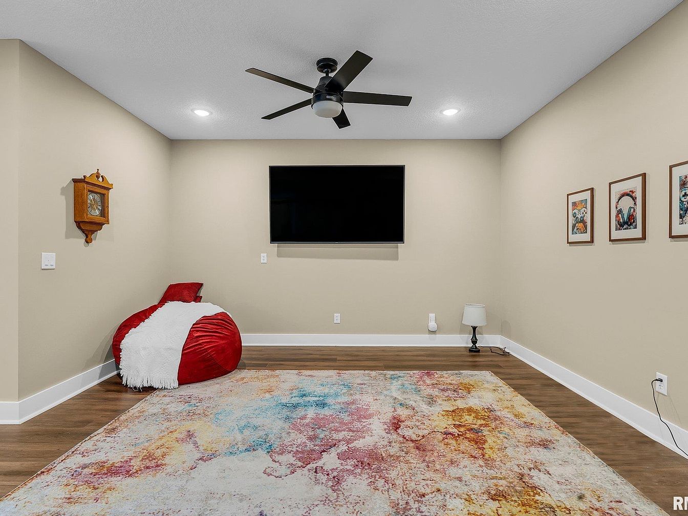This cozy media room features a wall-mounted flat-screen TV as its focal point, surrounded by neutral beige walls that create a warm backdrop. A large, colorful area rug anchors the space, blending soft hues of blue, orange, yellow, and pink, complementing the rich, dark wood flooring. A plush red beanbag chair with a white throw blanket invites relaxation. Minimalist yet charming decorations include a classic wooden wall clock and a small black lamp with a white shade placed on the floor. Modern recessed lighting and a sleek black ceiling fan enhance the room’s comfort and simplicity.