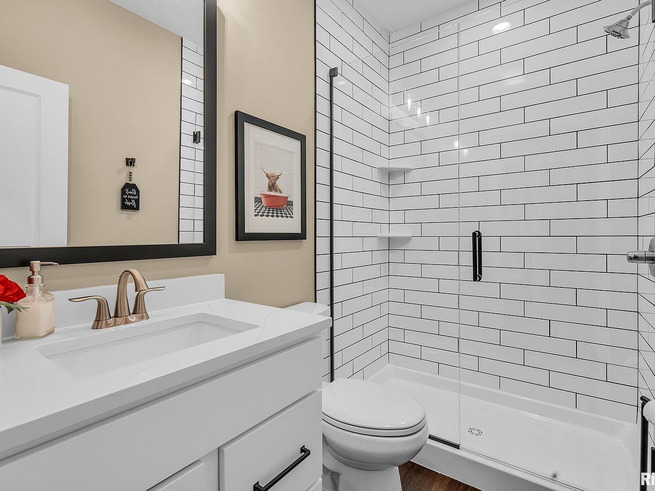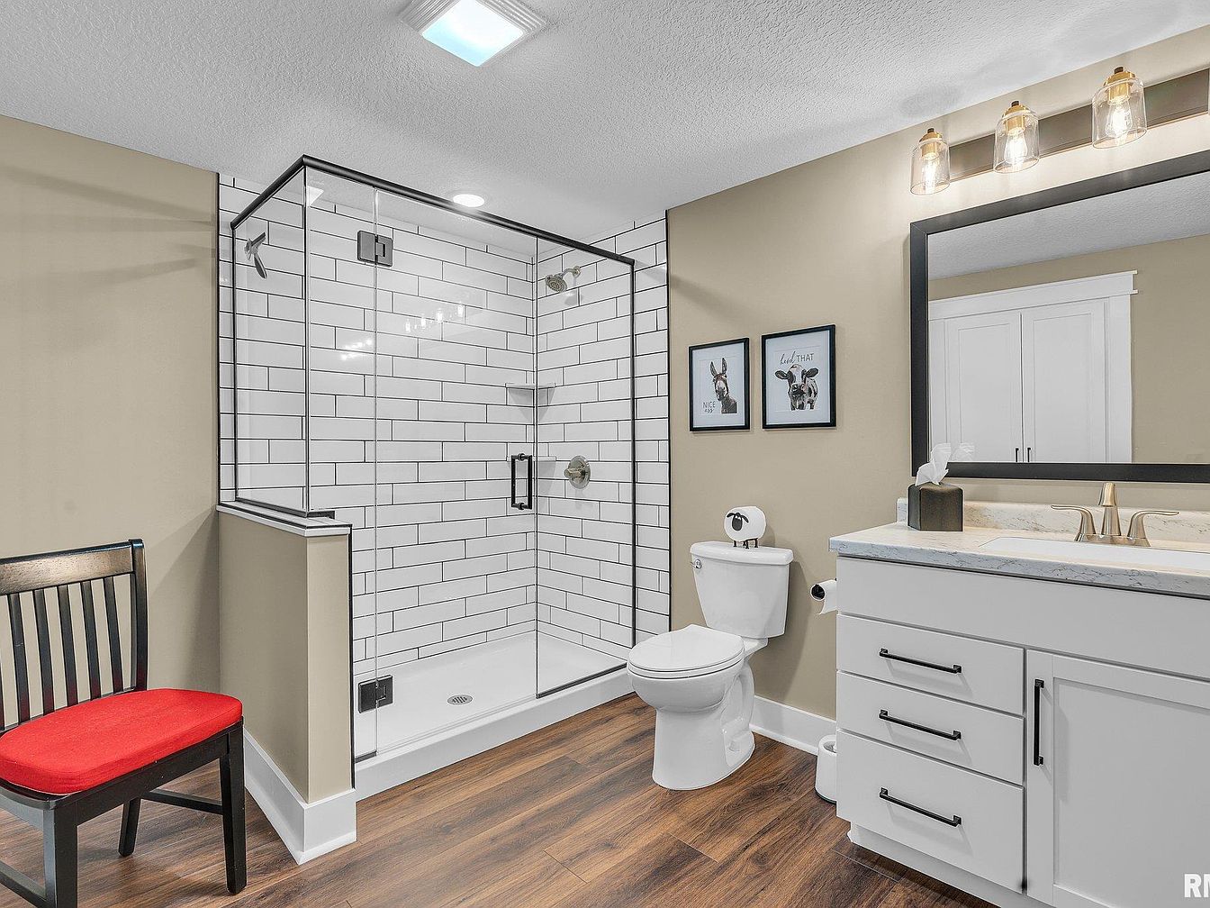 This bathroom features a modern walk-in shower encased in clear glass with sleek black framing, accented by white subway tiles with contrasting grout. The shower area is spacious and well-lit with a recessed ceiling light. Opposite the shower is a white toilet, topped with playful black-and-white themed artwork that adds a whimsical touch. A white vanity with black hardware and a marble countertop holds a large, dark-framed mirror under three vintage-style light bulbs, providing ample softness and warmth. The room’s beige walls and wood-look flooring offer a warm, inviting ambiance, complemented by a simple black chair with a vibrant red cushion.