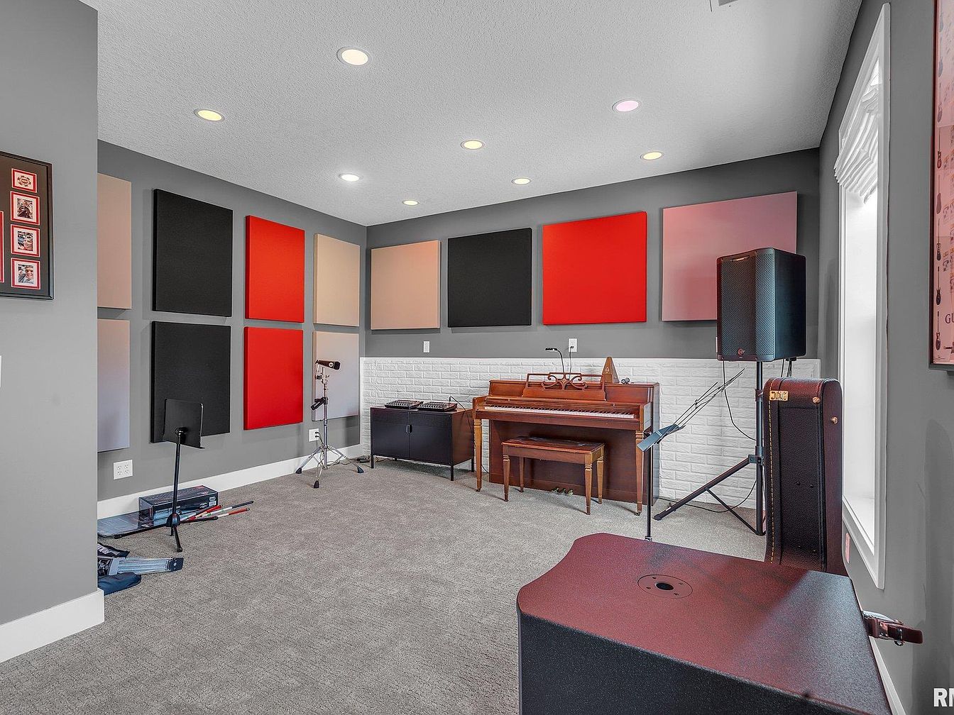 This music room is designed with sound control in mind, featuring an array of colorful acoustic panels in black, red, and beige that are evenly spaced along the gray walls. The lower half of the back wall is accented with white textured brick, adding depth and contrast. A polished wooden upright piano with a matching bench anchors the room’s focal point. Neutral-toned carpeting covers the floor, providing warmth and sound dampening. Professional music equipment, including speakers and stands, is arranged thoughtfully, creating an inviting, functional space for both practice and performance.