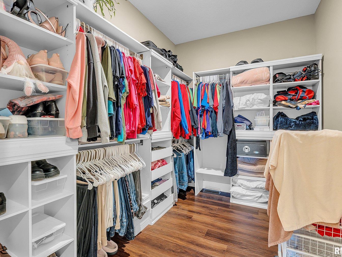 This spacious walk-in closet offers a well-organized and functional storage solution. It features white built-in shelving and hanging rods on two adjacent walls, cleverly maximizing the corner layout. The clothing is neatly arranged by color, with casual wear such as hoodies, t-shirts, and jeans on display. Open shelves above and below the hanging sections provide space for shoes, bags, and folded items. The warm wood flooring contrasts softly with the neutral beige wall color, creating a clean yet inviting atmosphere. A beige throw draped over a storage cart adds a cozy touch to this practical dressing area.