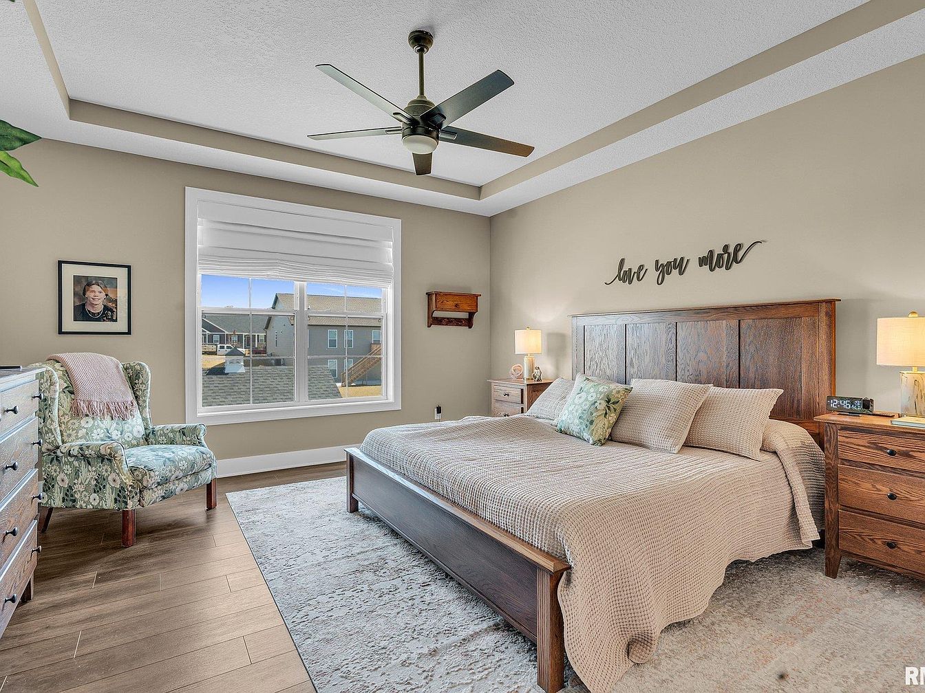 This master bedroom features a calm and inviting atmosphere with a muted beige wall color that complements the rich wooden furniture. A large, solid wood bed with a matching headboard takes center stage, adorned with neutral-toned bedding and a single decorative pillow in soft green tones. On either side, wooden nightstands with lamps provide balanced lighting. The room includes a patterned armchair with a cozy throw placed near a wide window framed with clean white trim, offering natural light and views of the neighborhood. The ceiling’s recessed tray design with a modern ceiling fan adds architectural depth and a contemporary touch. A textured area rug provides warmth and softness to the light wood flooring, enhancing the relaxing vibe.