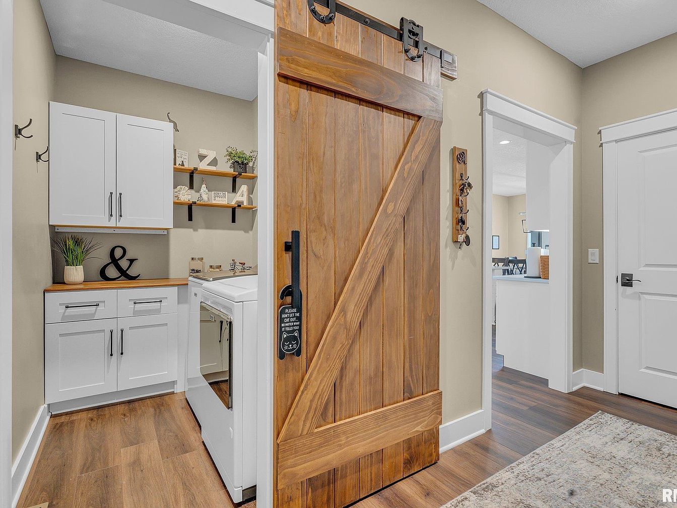 This cozy laundry nook is accessed through a striking rustic sliding barn door made of rich, natural wood with visible grain and black iron hardware, adding a warm farmhouse charm. Inside, the space is efficiently organized with white cabinetry providing ample storage, complemented by two wooden shelves decorated with small plants and decorative letters, creating a welcoming ambiance. The flooring is a medium-tone wood laminate that flows seamlessly into the hallway, which features beige walls and crisp white trim. The adjacent hallway offers a glimpse into an open-concept living area, highlighting clean lines and a neutral, earthy palette.
