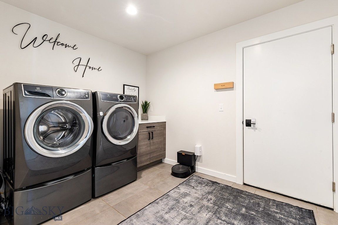 This laundry room features a modern, clean design with a neutral color palette dominated by whites, grays, and touches of black. The side-by-side front-loading washer and dryer in sleek dark finishes stand on raised pedestals for ergonomic access. Adjacent to the appliances is a compact wooden cabinet topped with a white countertop, perfect for sorting or folding clothes. The walls are pristine white, accented by a stylish “Welcome Home” wall art in cursive script that adds warmth and character. A dark textured rug covers part of the tiled floor, and a small potted plant adds a natural touch. The space feels airy and functional with a simple, contemporary aesthetic.