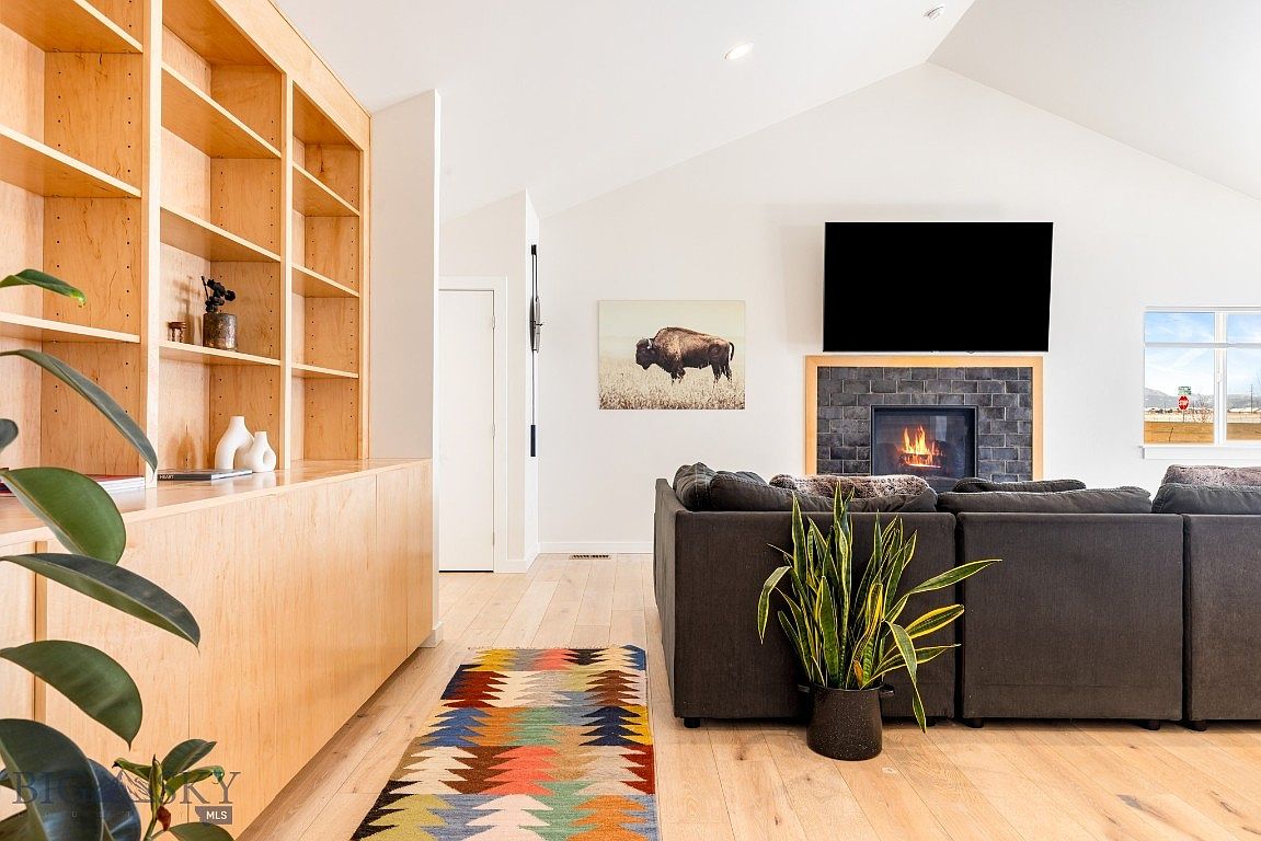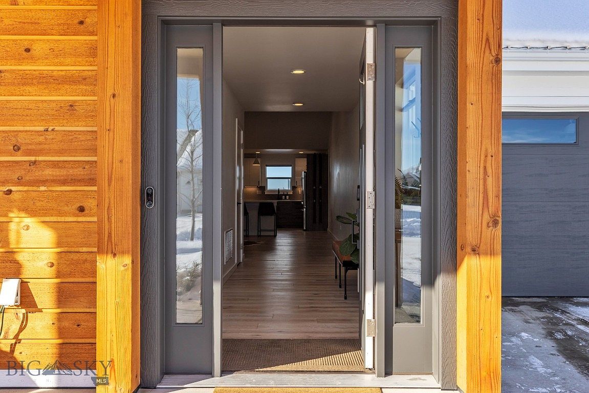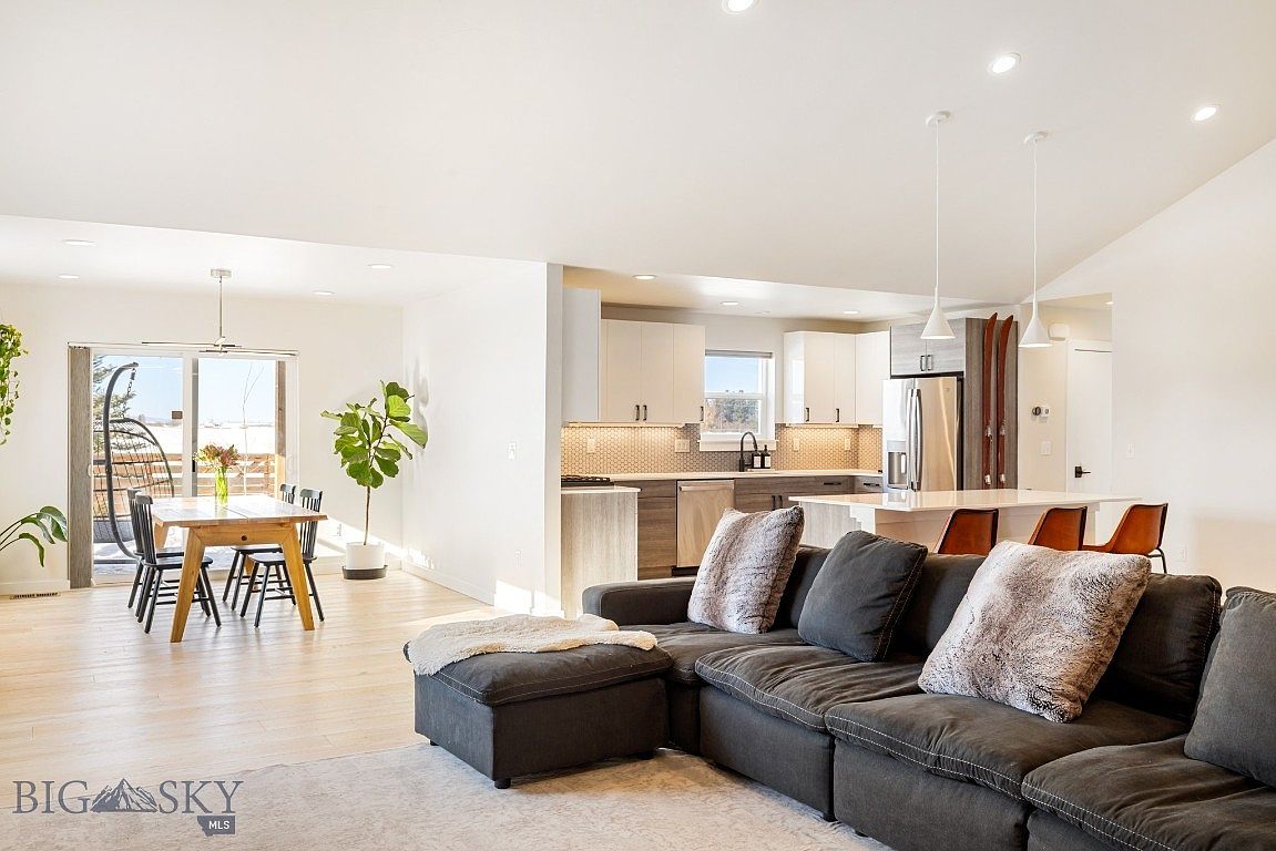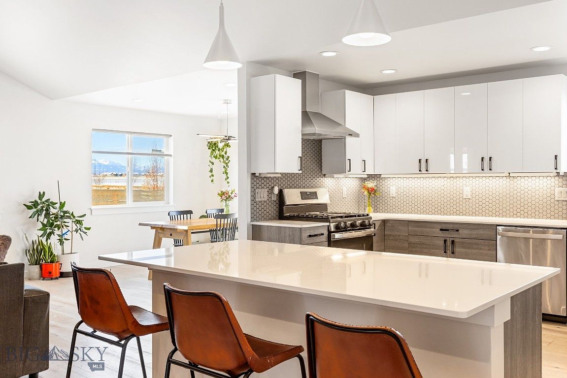 This elegant home, situated in the desirable Flanders Mill neighborhood of Bozeman, MT, epitomizes modern single-level living with a blend of contemporary and craftsman architectural elements. Featuring a well-maintained exterior with clean lines, a combination of white siding and warm wood accents, and a dark, pitched roof, the design offers both curb appeal and functionality. Built recently, this residence boasts 3 bedrooms and 2 bathrooms, with a spacious layout of total square footage and plot area designed for comfort and convenience—specific figures are not provided but the generously sized driveway and two-car heated garage hint at ample space. The interior showcases vaulted ceilings, custom built-ins, and an inviting fireplace, creating a bright and airy living space perfect for both relaxation and entertaining. The kitchen is a highlight with a large island, a gas range, built-in microwave, and a substantial pantry, combined with sleek modern finishes to satisfy any culinary enthusiast. The primary suite is thoughtfully positioned at the home’s far end to maximize privacy, while the front bedrooms offer extraordinary views of the Bridger Mountains, enhancing the home’s natural charm. Outside, the west-facing backyard extends the living space with a sizable patio, hot tub, and beautifully landscaped surroundings, ideal for witnessing Bozeman’s stunning sunsets. Additional features include a spacious laundry/utility room, automatic blinds, air conditioning, and extensive landscaping that add to the home’s comfort and usability. Offered at $925,000, this meticulously cared-for home represents the perfect fusion of style, comfort, and convenience in a prime location, making it an exceptional opportunity in the Bozeman real estate market.