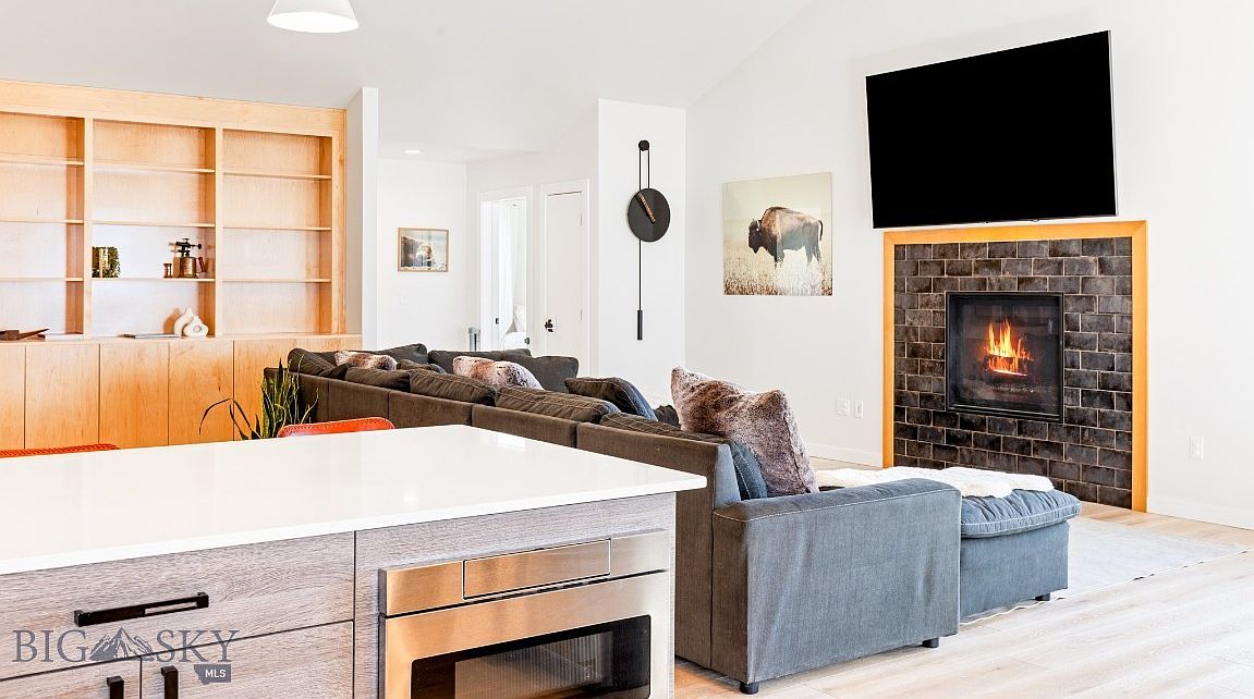 This open-concept space blends a modern kitchen with a cozy living area. The kitchen island features a smooth white countertop and light-gray wood cabinetry with sleek black handles, also housing a built-in stainless steel microwave. Adjacent is a spacious charcoal sectional sofa adorned with soft, textured pillows positioned to face the living room’s focal fireplace. The fireplace is framed with glossy black tiles trimmed in warm wood, topped by a large flat-screen TV. Light wood built-in shelving adds storage and display options, complementing the light-colored wood flooring and the neutral white walls that brighten the room with natural light. Minimalist décor, such as a round black wall clock and a buffalo print, enhance the subtle rustic-modern aesthetic.