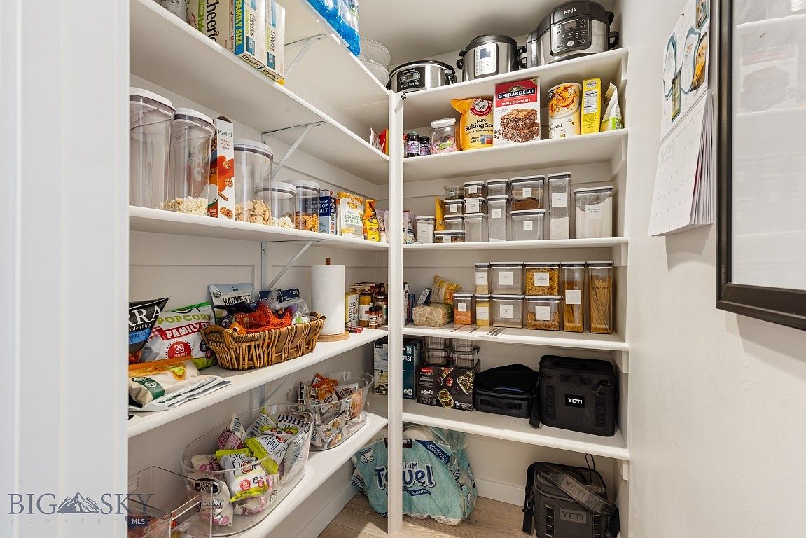This well-appointed pantry features white wood shelving that maximizes vertical storage space in an L-shaped layout. Clear, labeled containers hold various dry goods such as pasta, baking ingredients, and snacks, providing a clean, organized aesthetic. The color scheme is neutral, dominated by white walls and shelves complemented by the natural wood grain floor. Everyday items like snack bags, paper towels, and kitchen appliances are neatly arranged, suggesting thoughtful organization. The pantry balances practicality and visual order, perfect for maintaining kitchen essentials within easy reach while keeping the space tidy and inviting.