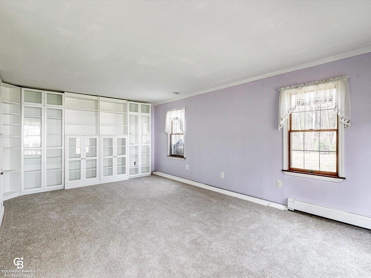 This spacious living room features a soft lavender wall paired with light gray carpeting, creating a calming and neutral palette. Two tall, narrow windows with delicate sheer curtains allow natural light to fill the room gently. The focal point is a striking, built-in wall unit with multiple glass-front cabinets and open shelving in a crisp white finish, providing ample display and storage space. The ceiling is clean and white, and white baseboard heating lines the perimeter, adding subtle architectural detail. The room’s simplicity invites versatile furnishing and personalized decor.