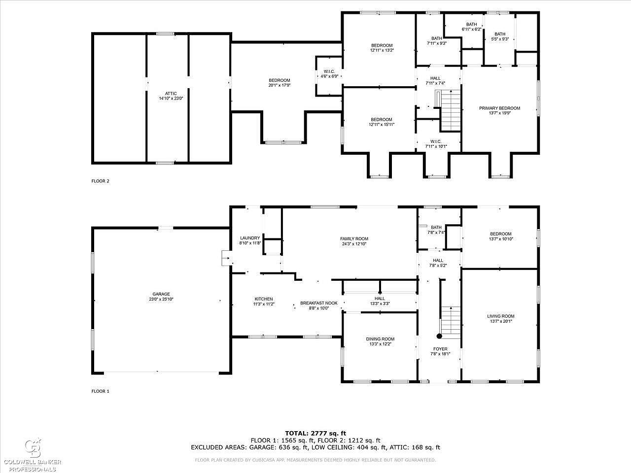 This detailed floor plan reveals a spacious two-story home with a total of 2,777 square feet. The first floor features an open layout with a large family room, kitchen with a breakfast nook, dining room, living room, and an additional bedroom, alongside a laundry area and a sizable two-car garage. The foyer serves as a central access point to the main living areas and a bathroom. Upstairs houses four bedrooms including a primary bedroom with walk-in closets and attached bathrooms, plus ample attic space. The design emphasizes clear separations between public and private spaces for functional family living.