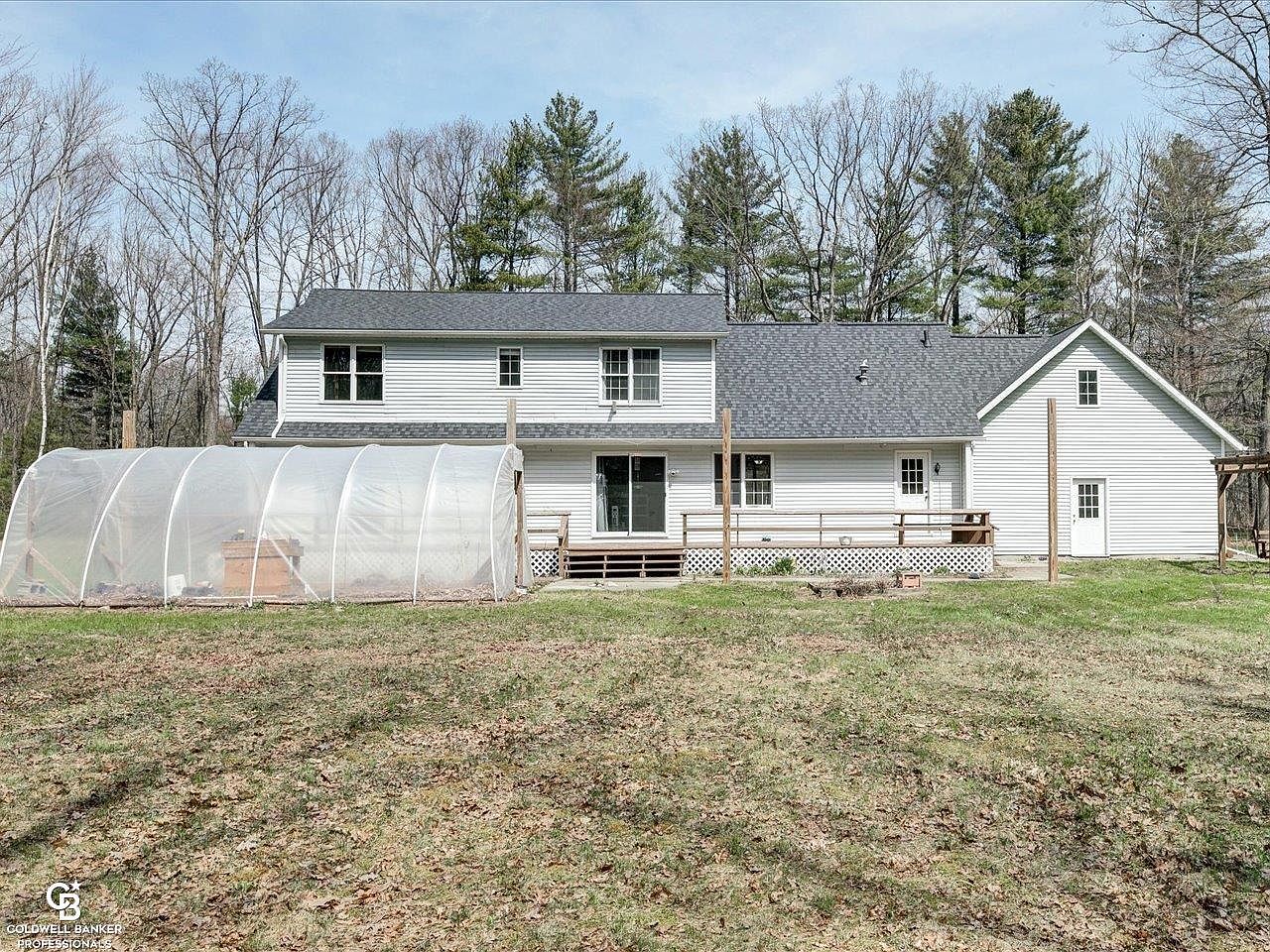 This spacious backyard features a charming, two-story white house with dark gray roofing, set against a backdrop of tall trees. The rear exterior boasts several windows and doors, including sliding glass doors that open onto a wooden deck with a simple railing. Adjacent to the deck is a long, arched greenhouse structure with a translucent cover, perfect for gardening enthusiasts. The green lawn is plentiful but shows some early spring leaf litter. The design blends functional outdoor space with natural surroundings, making it ideal for outdoor living, gardening, and enjoying peaceful, wooded views.