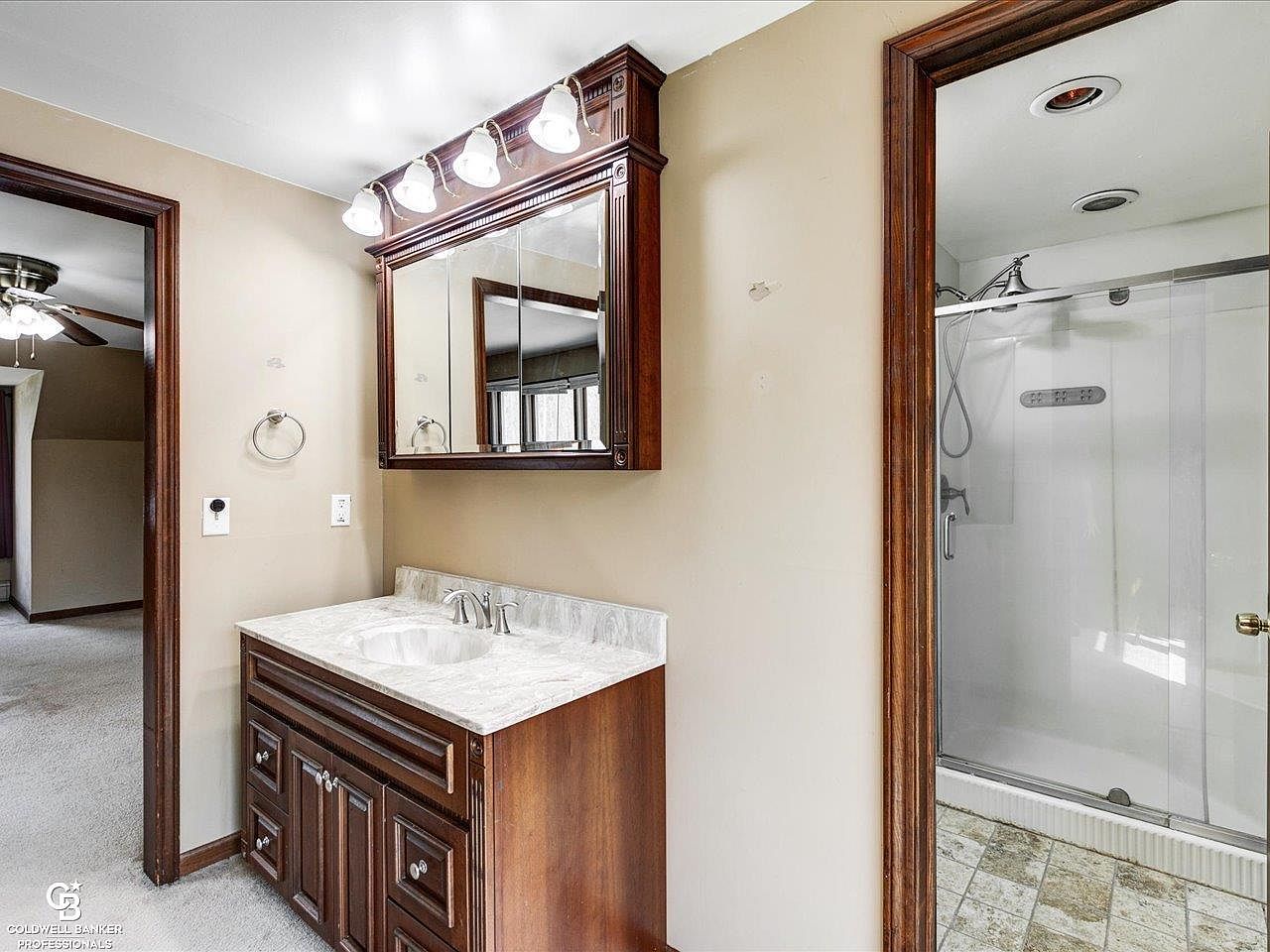 This bathroom features a classic wooden vanity with a marble countertop that blends elegance and functionality. Above the sink is a large mirrored cabinet framed with matching wood, complemented by four bright vanity lights. The warm beige walls and rich wood trim around the doors add a cozy traditional feel. To the right, a glass-enclosed shower with modern silver fixtures sits over a stone-patterned tile floor, merging contemporary elements with a timeless design. The adjacent doorway opens into a carpeted room, visible with a ceiling fan, linking this space to the rest of the home.