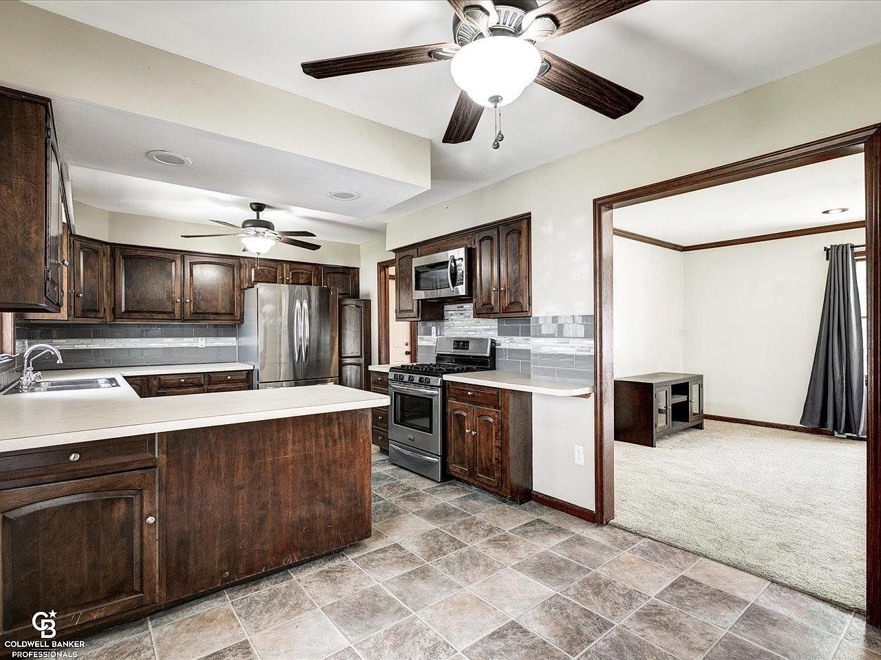 This kitchen features a U-shaped layout with dark wood cabinetry, providing ample storage space. The cabinetry pairs elegantly with light beige countertops that contrast subtly against the tiled backsplash in various shades of gray and off-white. Stainless steel appliances, including a double-door refrigerator, gas stove, and built-in microwave, enhance the modern convenience of the space. Two ceiling fans with light fixtures above help circulate air and add to the home’s comfort. Adjacent to the kitchen is a room with carpeted floors, neutral-colored walls, and a simple TV stand, hinting at a cozy living or dining area connected through a wide, dark wood-trimmed doorway.