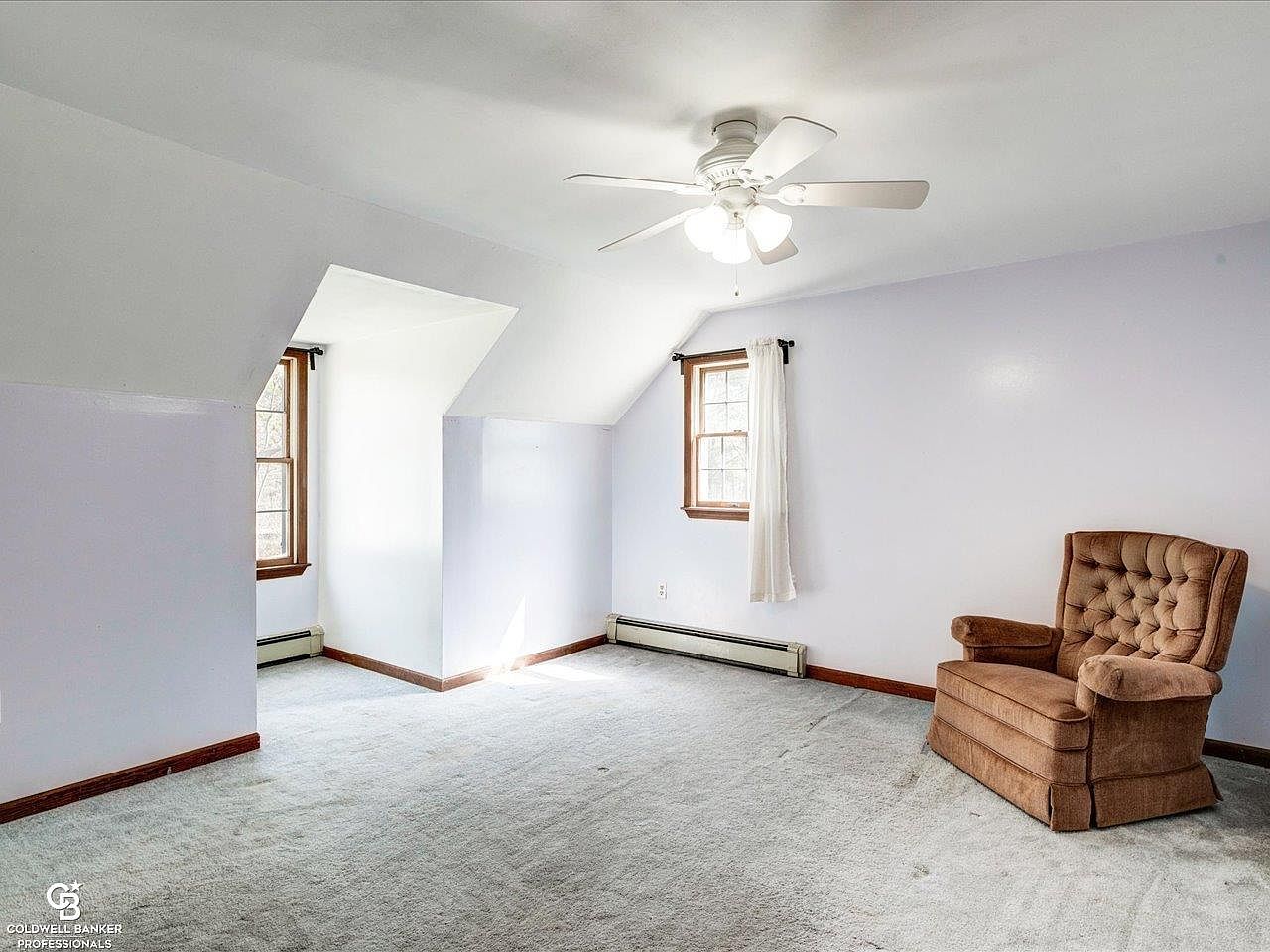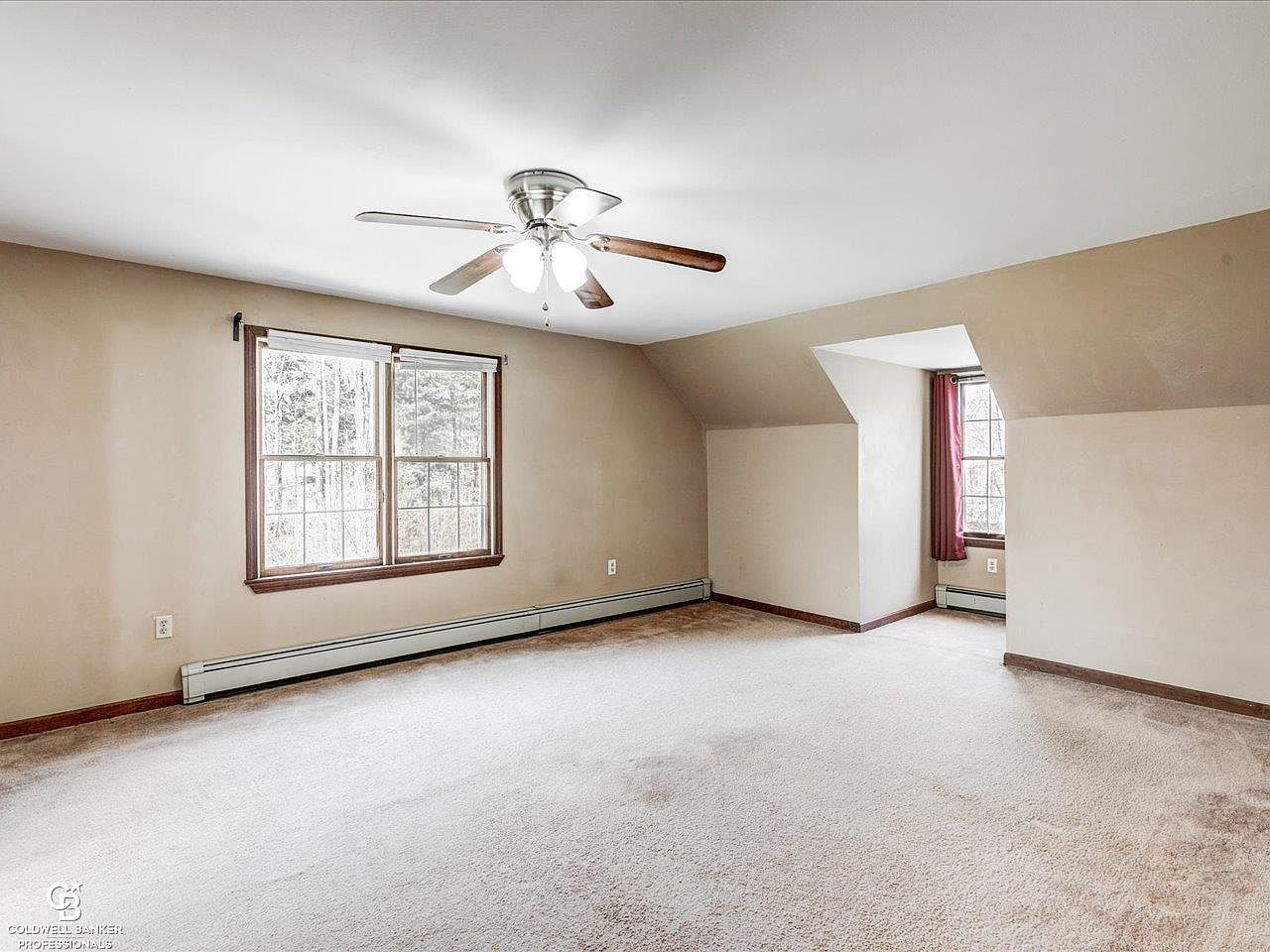 This spacious upstairs bedroom features a soft neutral palette with beige walls and light carpeting that extends throughout the room, creating a warm and inviting atmosphere. Natural light pours in through two double hung windows with wooden trim, highlighting the room’s gently sloping ceilings and an intriguing recessed nook area, ideal for a reading corner or small workspace. A ceiling fan with wood-tone blades and integrated lighting offers both comfort and style. The baseboard heating runs along the walls, blending seamlessly with the room’s understated yet functional design.