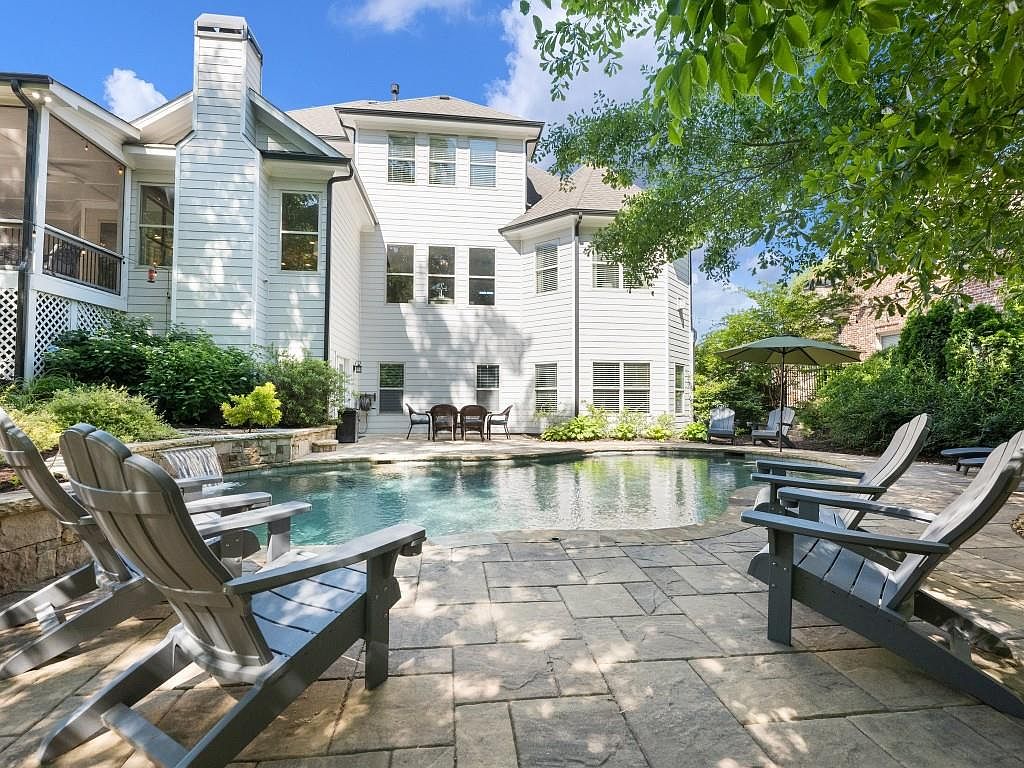 A serene backyard oasis featuring a spacious, curved swimming pool surrounded by a stone-paved patio. Several Adirondack chairs provide seating for relaxation in a cool gray finish that contrasts nicely with the natural stone floor. Lush green shrubs and trees border the area, adding privacy and a natural feel. The house’s white siding with multiple windows reflects sunlight onto the pool, brightening the space. A dining table with chairs sits near the house, ideal for outdoor meals. An umbrella shades additional seating, blending comfort with a peaceful, inviting atmosphere in an outdoor retreat.