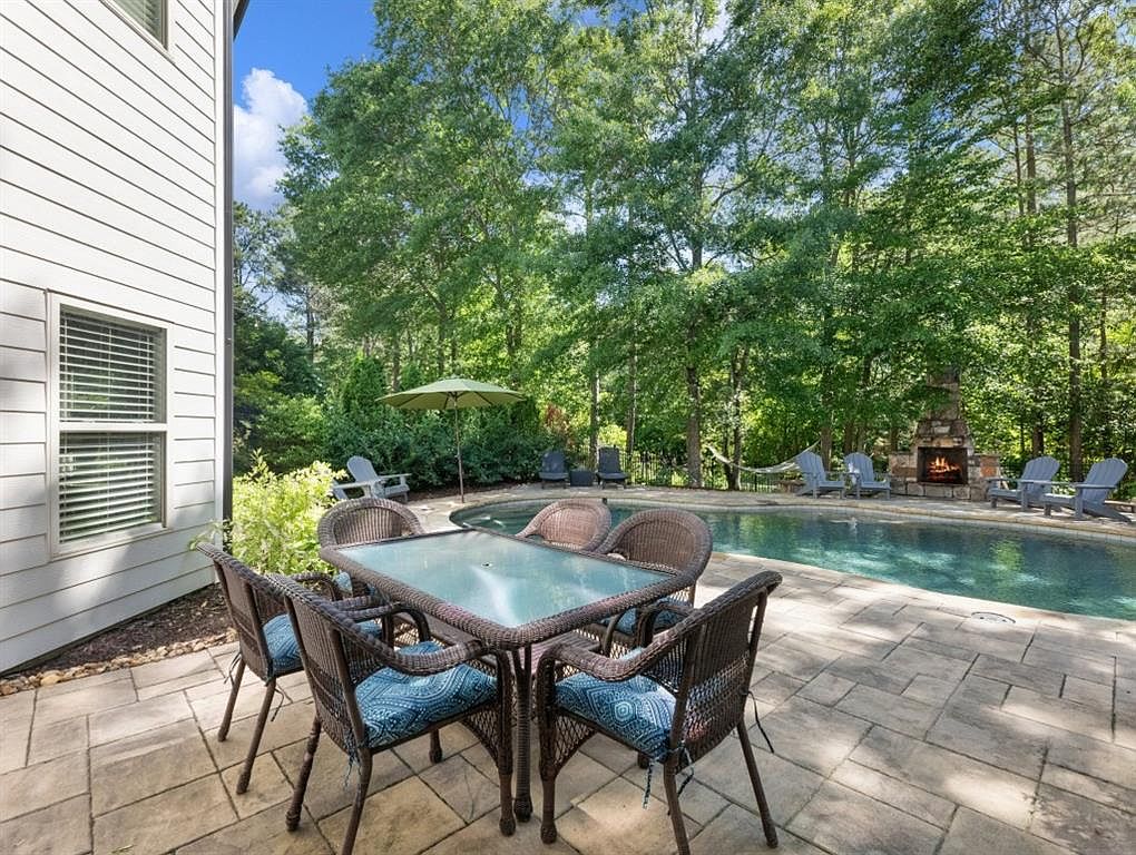 This serene backyard patio features a spacious stone-paved deck that seamlessly integrates with a sparkling swimming pool. A glass-topped, wicker dining table with six cushioned chairs anchors the space, offering comfortable outdoor dining. Nearby, a large green umbrella provides shade, situated beside grey Adirondack chairs scattered by the poolside for relaxation. The stone fireplace, surrounded by additional chairs, adds warmth and ambiance for cooler evenings. Lush green trees form a natural backdrop that enhances privacy and tranquility, creating an inviting outdoor retreat that balances functionality with nature-inspired aesthetics.