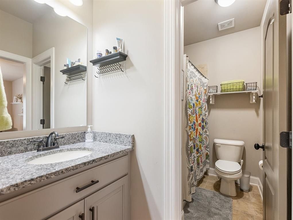 This compact bathroom blends functionality with subtle charm. The granite countertop, in soft gray tones, sets a polished foundation for the white undermount sink and dark bronze faucet, adding a modern yet classic touch. Below, the light-colored cabinetry offers ample storage, coordinated with dark handles that enhance the contrast. A large mirror and simple wall-mounted shelf with hooks provide practical storage and utility. The bathroom extends to a tub area with a colorful, patterned shower curtain, which livens the neutral beige walls and beige floor tiles. A white porcelain toilet sits beneath a floating shelf decorated with neatly arranged baskets and towels, completing the clean and cozy design.