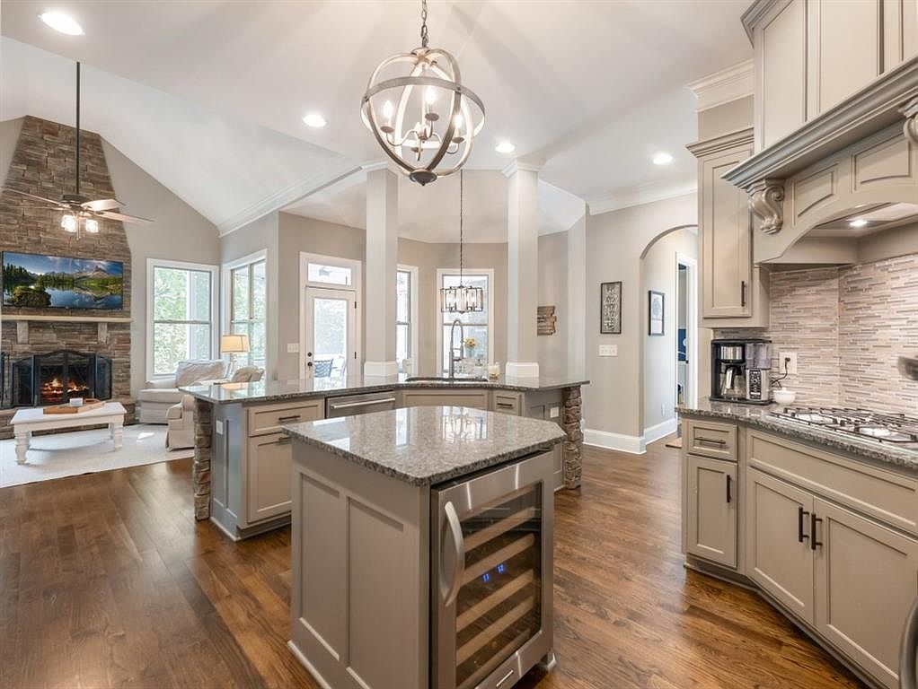 This open concept kitchen features a central island with a built-in wine cooler, topped with polished granite countertops that enhance the neutral palette. Cabinets in muted taupe tones with black hardware complement the light gray tile backsplash with subtle horizontal patterns, adding texture behind the stovetop. Elegant pendant lights hang above both the island and the adjacent peninsula, illuminating the hardwood floors that run seamlessly into the living area. The living space includes a stone fireplace with a flat-screen mounted above, anchored beneath the vaulted ceiling and surrounded by large windows, inviting natural light to fill the airy room.