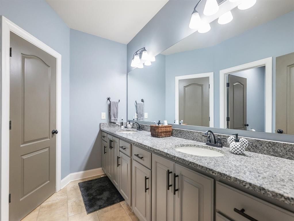 This bathroom features a spacious double-sink vanity with a long granite countertop, providing ample space for personal care items. The cabinetry below is painted a muted gray, equipped with sleek black handles for a modern touch. The walls are painted a calming light blue, complementing the neutral tones of the beige floor tiles. A large mirror spans the length of the vanity, enhancing the sense of openness and brightness by reflecting the soft white light fixtures above. Two matching doors, painted in a complementary taupe shade, maintain a cohesive appearance. A black bath mat adds subtle contrast near the cabinetry, completing the polished and functional design.