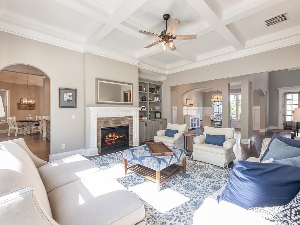 This living room features a sophisticated and inviting setup with neutral tones dominating the walls and furniture. A white fireplace with a stone surround serves as the centerpiece, topped by a large mirror reflecting light and space. The ceiling is coffered with a stylish ceiling fan in the middle, enhancing architectural interest while providing functionality. Comfortable white armchairs with blue accent pillows surround a blue patterned ottoman coffee table resting on a coordinating rug. The open layout connects seamlessly to adjacent rooms through arched passages, while built-in shelves display décor, adding personality to the space.