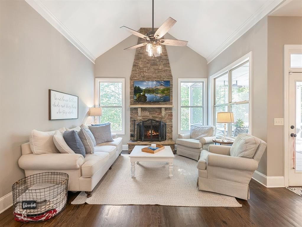 This cozy family room features a vaulted ceiling with subtle crown molding, creating an airy and spacious atmosphere. The central focus is a rustic, stone-clad fireplace topped with a mounted flat-screen TV, flanked by two large windows inviting natural light. The room is furnished with a long, cream-colored sofa adorned with neutral and soft blue throw pillows, and two comfortable, cushioned armchairs in a light striped fabric. A white wooden coffee table sits on a plush, light-toned area rug spread over rich dark hardwood floors. The decor is calm, neutral, and inviting.