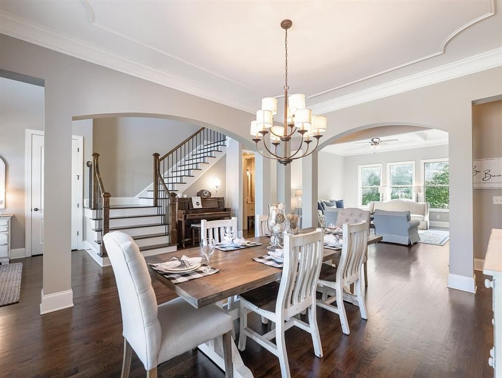 This space features an open-concept layout with a dining area prominently in the foreground, furnished with a wooden dining table and a mix of white distressed chairs and upholstered end chairs. Above the table hangs an elegant chandelier with multiple lights, providing warm illumination. Soft neutral wall tones complement the rich dark hardwood floors, creating a balanced and inviting atmosphere. Two wide arches frame the transition to the living room and staircase area, enhancing flow and architectural interest. The living room, visible in the background, offers light-colored seating near large windows that fill the area with natural light. A traditional staircase with dark wooden railing and white risers ascends beside a vintage-style piano, adding character and charm.