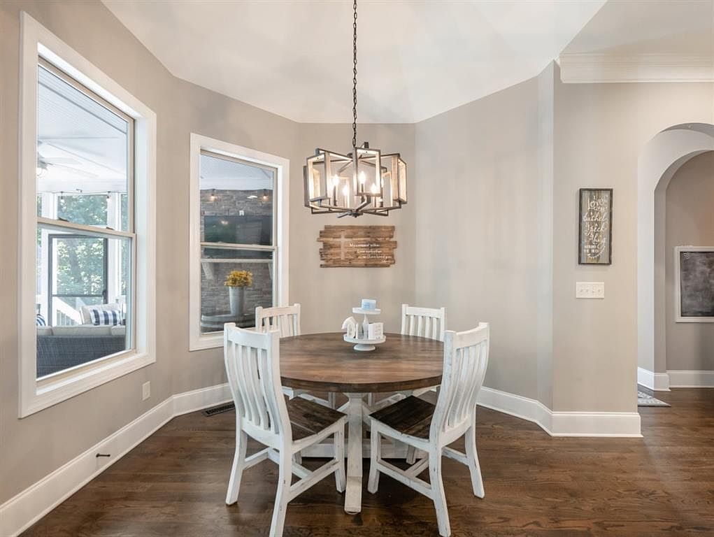 This cozy breakfast nook features a round wooden table with a rich, dark finish complemented by four white wooden chairs that add a charming contrast. The space benefits from natural light streaming in through two large windows, creating an inviting atmosphere. The walls are painted in a soft neutral tone, enhancing the warm oak hardwood flooring. A modern, geometric pendant light fixture hangs centered above the table, providing focused illumination. The nook is slightly recessed with an angled wall, gently separating it from the adjoining areas, contributing to its intimate and functional design.