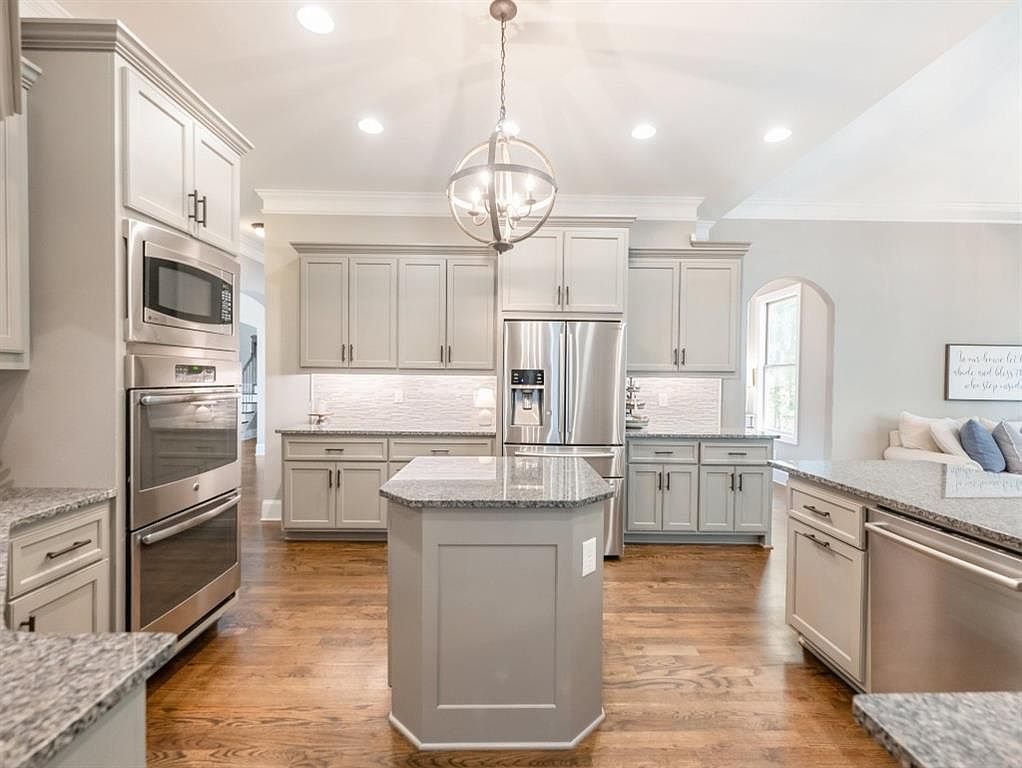 This kitchen features a central island with a polished granite countertop, painted in a soft gray that complements the surrounding cabinetry. The cabinetry is classic shaker style with simple black hardware, matched with stainless steel appliances including a double oven, microwave, and a French door refrigerator. Warm hardwood floors add a natural contrast to the predominantly neutral palette. Above the island, a spherical chandelier with multiple bulbs offers elegant lighting. The overall layout is open and inviting, flowing seamlessly into an adjacent living area visible through the archway, creating a harmonious and functional cooking space.