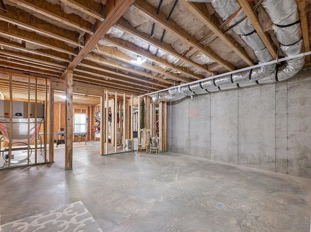 This expansive basement features an open and unfinished layout with exposed wooden joists and insulation on the ceiling, creating a raw yet inviting setting. The concrete floor and solid concrete walls offer a clean slate for potential customization. Visible in the space is notable ductwork lining the ceiling, emphasizing practical climate control considerations. Light filters in from the adjoining room through a framed doorway without drywall, allowing natural daylight from the living area to brighten the basement. Two wooden chairs and a small table hint at the space’s versatility while the neutral, utilitarian palette highlights its future possibility as a workshop, recreational area, or additional living quarters.