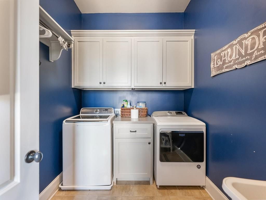 This compact laundry room features a clean and functional layout with a top-loading washing machine on the left and a matching front-loading dryer on the right. Between them sits a small built-in cabinet with a drawer and cupboard for additional storage, topped with a neutral countertop. Above the machines are white, shaker-style wall cabinets that offer extra space for laundry essentials, standing out crisply against the richly painted deep blue walls. The room has light beige tile flooring that complements the white trim and cabinetry, while a charming rustic sign on the wall adds a welcoming, playful touch to the space.