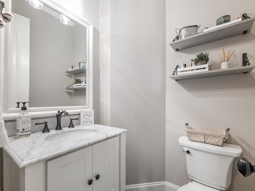 This bathroom corner highlights a clean, bright vanity area with a white marble countertop featuring an undermount sink and dark bronze faucet fixtures that add a touch of contrast. The vanity cabinet is white with simple panel doors and black knobs, complementing the neutral light gray walls that create a calm, modern atmosphere. Above the vanity is a large white-framed mirror that enhances the spacious feel. Adjacent to the toilet, two floating shelves hold decorative items and practical storage baskets, combining function with subtle farmhouse style accents for an inviting and organized look.
